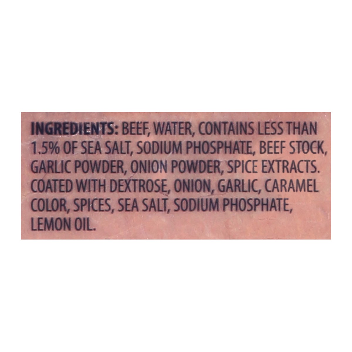 Beef, Water, Contains Less than 1.5% of Sea Salt, Sodium Phosphate, Beef Stock, Garlic Powder, Onion Powder, Spice Extracts, Coated with Dextrose, Onion, Garlic, Caramel Color, Spices, Sea Salt, Sodiu…