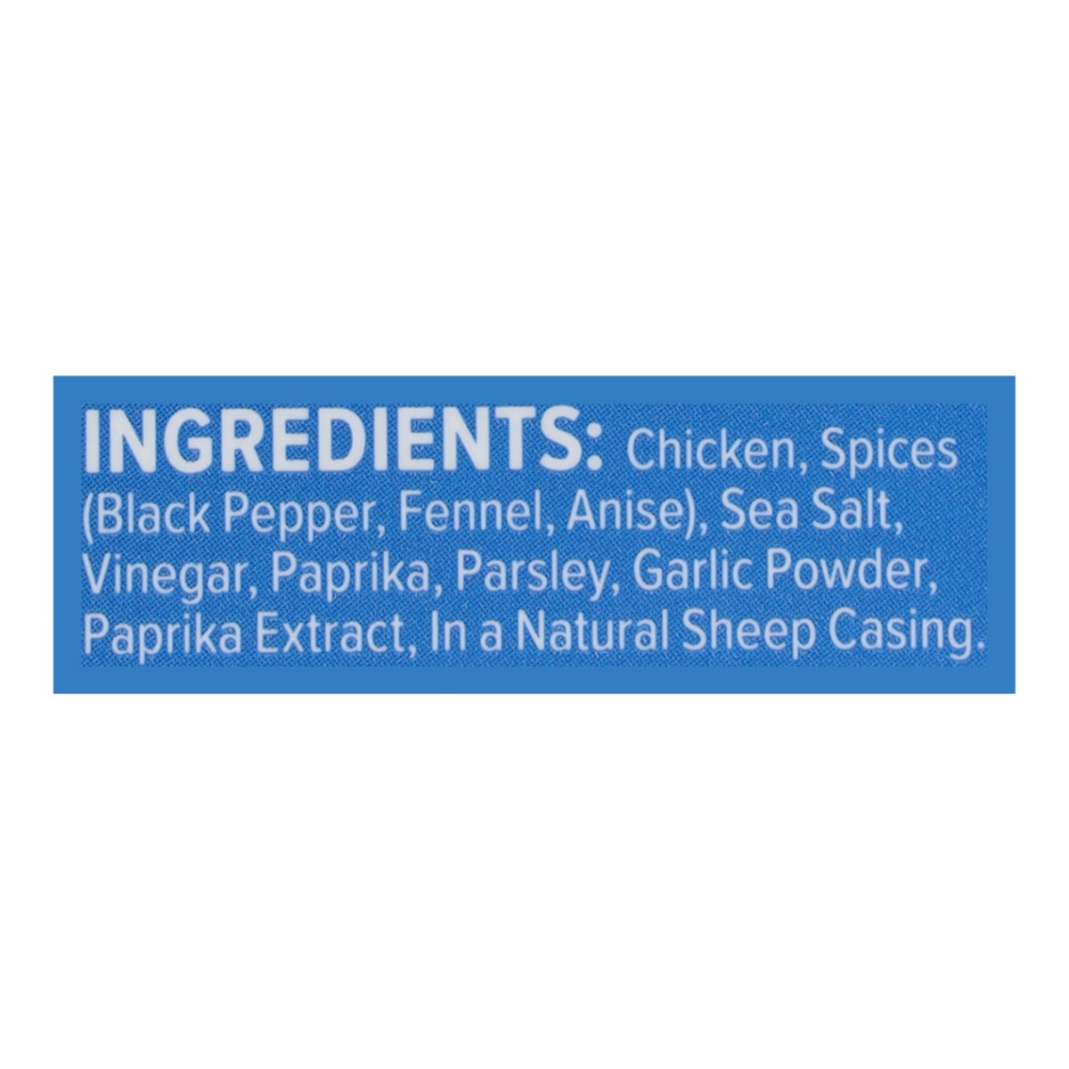 Chicken, Spices (Black Pepper, Fennel, Anise), Sea Salt, Vinegar, Paprika, Parsley, Garlic Powder, Paprika Extract, in a Natural Sheep Casing.