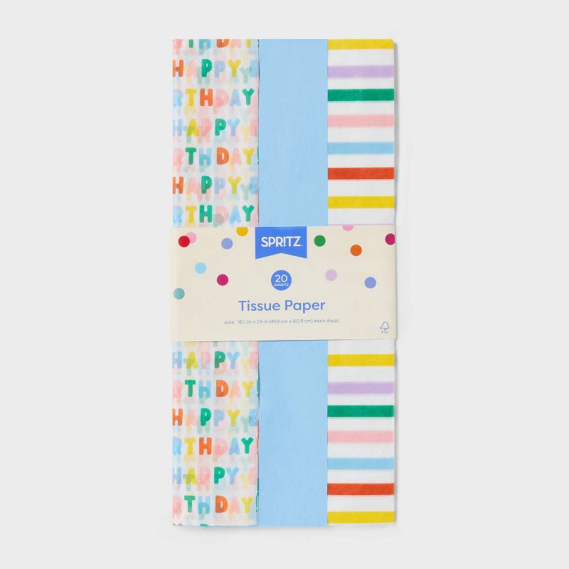 - Tissue paper set with “Happy Birthday,” striped and solid designs
