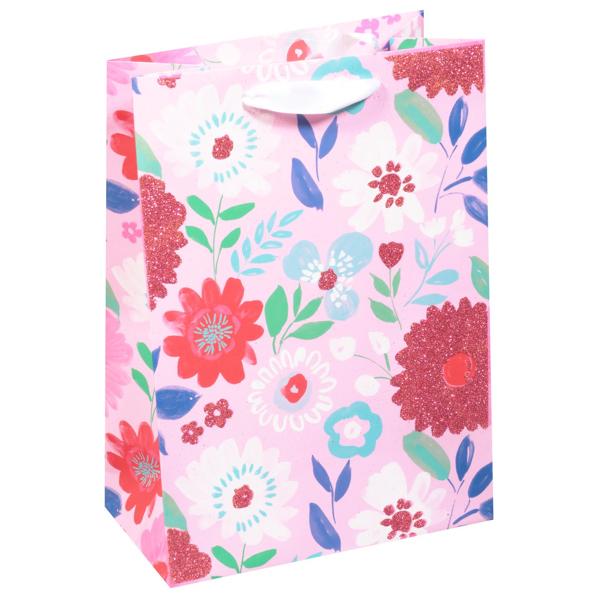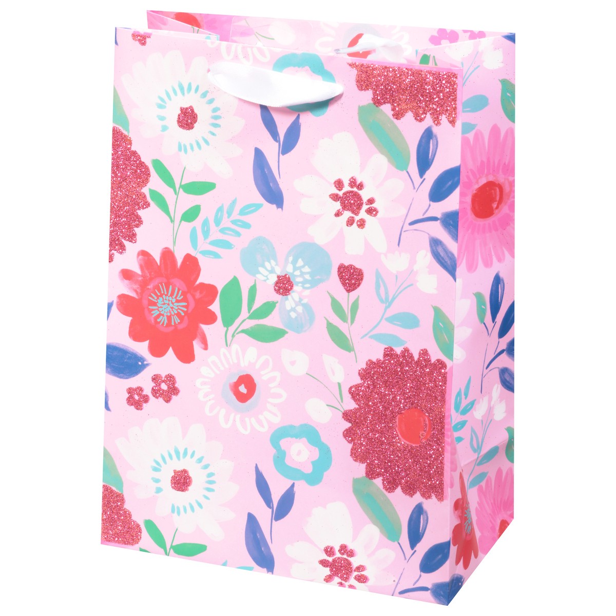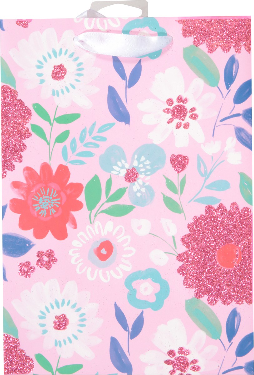 - This medium gift bag features an assortment of pink flowers sparkling with glitter.