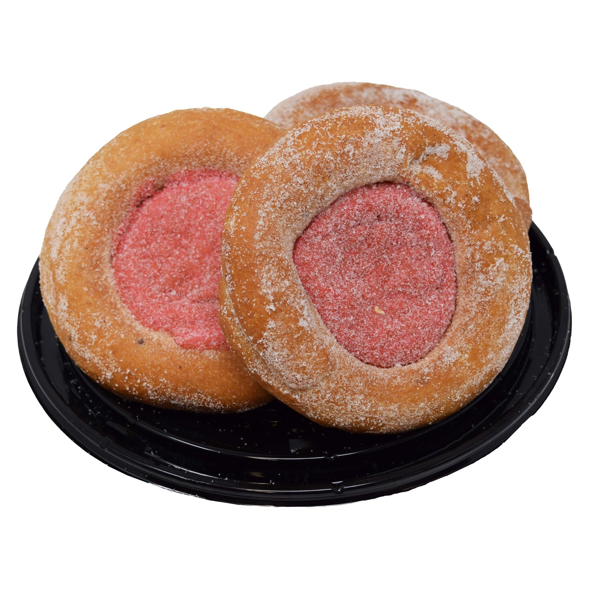 large pink chamucos (enriched unbleached malt flour (wheat flour, malted barley flour, niacin, reduced iron, thiamine mononitrate, riboflavin, folic acid), shortening (refined & bleached beef tallow, …