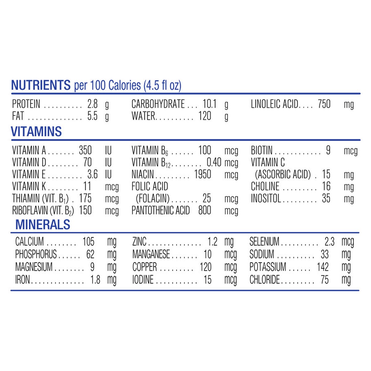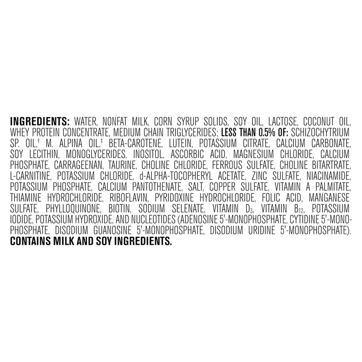Water, Nonfat Milk, Corn Syrup Solids, Soy Oil, Lactose, Coconut Oil, Whey Protein Concentrate, Medium Chain Triglycerides: Less than 0.5% of: Schizochytrium SP. Oil (Source of DHA), M. Alpina Oil (So…