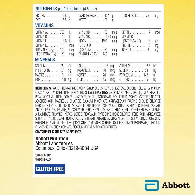 Water, Nonfat Milk, Corn Syrup Solids, Soy Oil, Lactose, Coconut Oil, Whey Protein Concentrate, Medium Chain Triglycerides: Less than 0.5% of: Schizochytrium SP. Oil (Source of DHA), M. Alpina Oil (So…