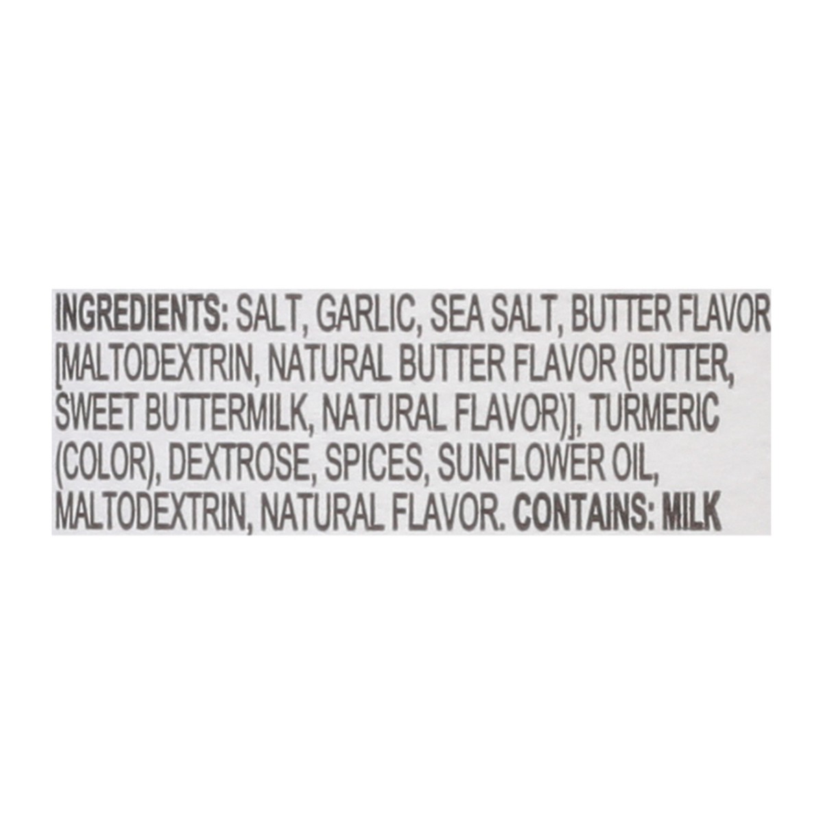 Salt, Garlic, Sea Salt, Butter Flavor [Maltodextrin, Natural Butter Flavor (Butter, Sweet Buttermilk, Natural Flavor)], Turmeric (Color), Dextrose, Spices, Sunflower Oil, Maltodextrin, Natural Flavor.