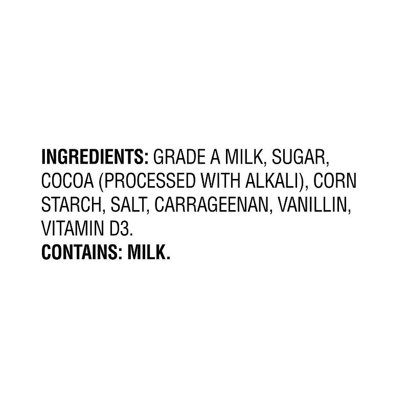 GRADE A MILK, SUGAR, NONFAT DRY MILK SOLIDS, COCOA (PROCESSED WITH ALKALI), CORN STARCH, SALT, CARRAGEENAN, NATURAL AND ARTIFICIAL FLAVORS, VITAMIN D3.