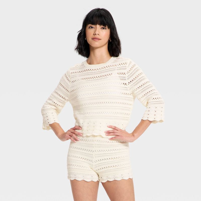 Women's Quarter Sleeve Openwork Crewneck Pullover Sweater - Universal Thread™ Cream XL