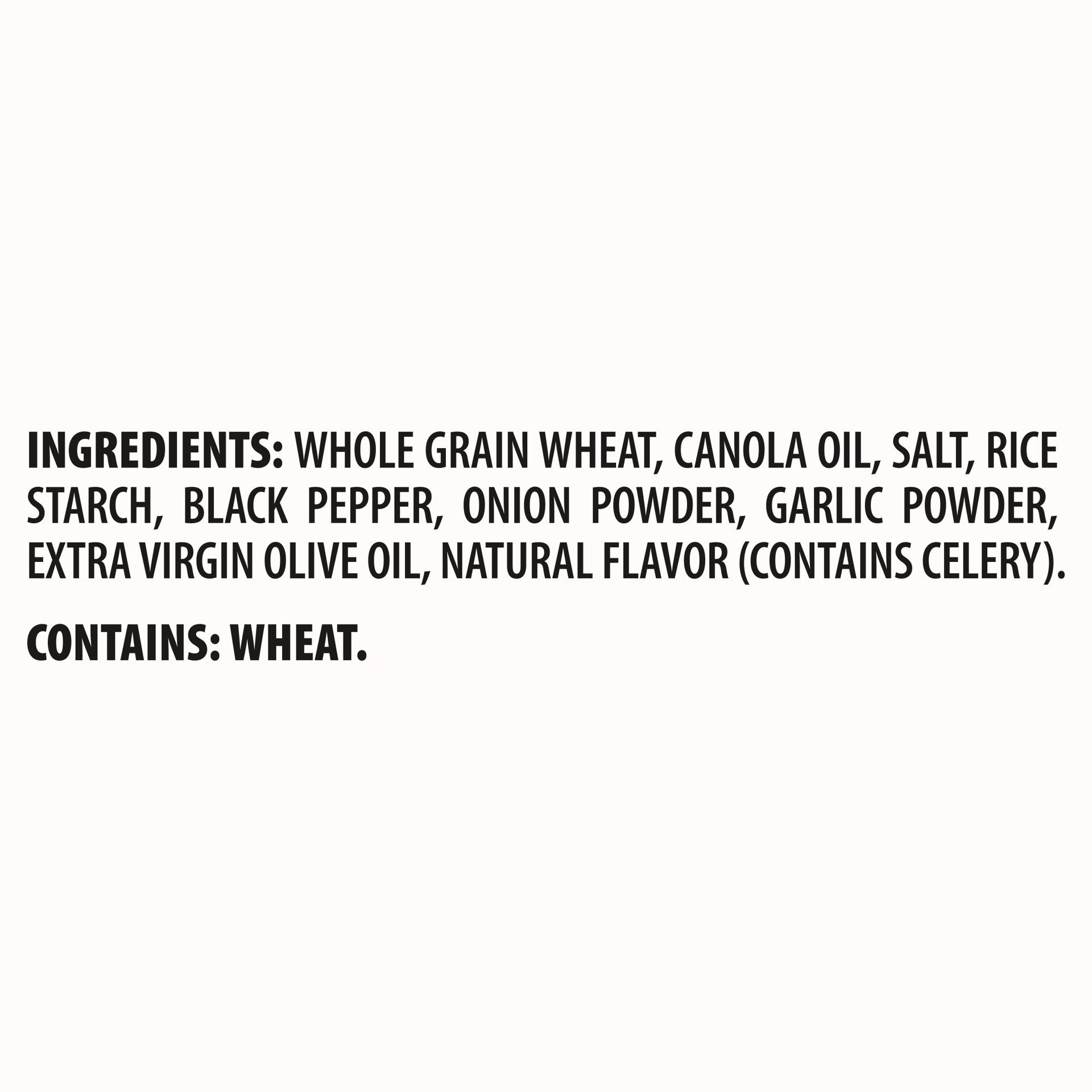 INGREDIENTS: WHOLE GRAIN WHEAT, CANOLA OIL, SALT, RICE STARCH, BLACK PEPPER, ONION POWDER, GARLIC POWDER, EXTRA VIRGIN OLIVE OIL, NATURAL FLAVOR (CONTAINS CELERY). CONTAINS: WHEAT.
