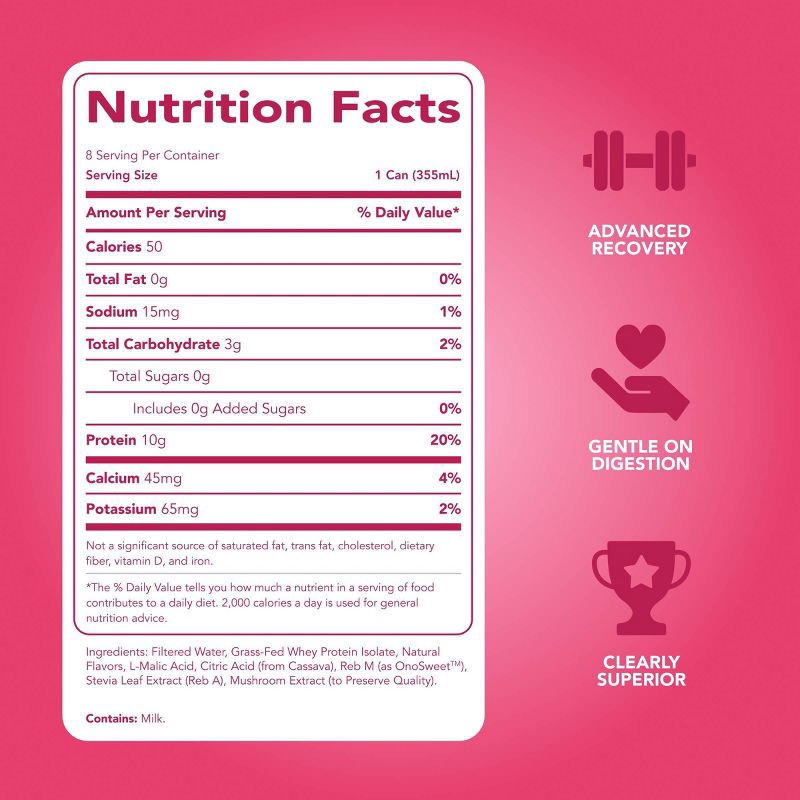 Filtered Water, Grass-Fed Whey Protein Isolate, Natural Flavors, L-Malic Acid, Citric Acid (from Cassava), Reb M (as OnoSweet), Stevia Leaf Extract (Reb A), Mushroom Extract (to Preserve Quality).