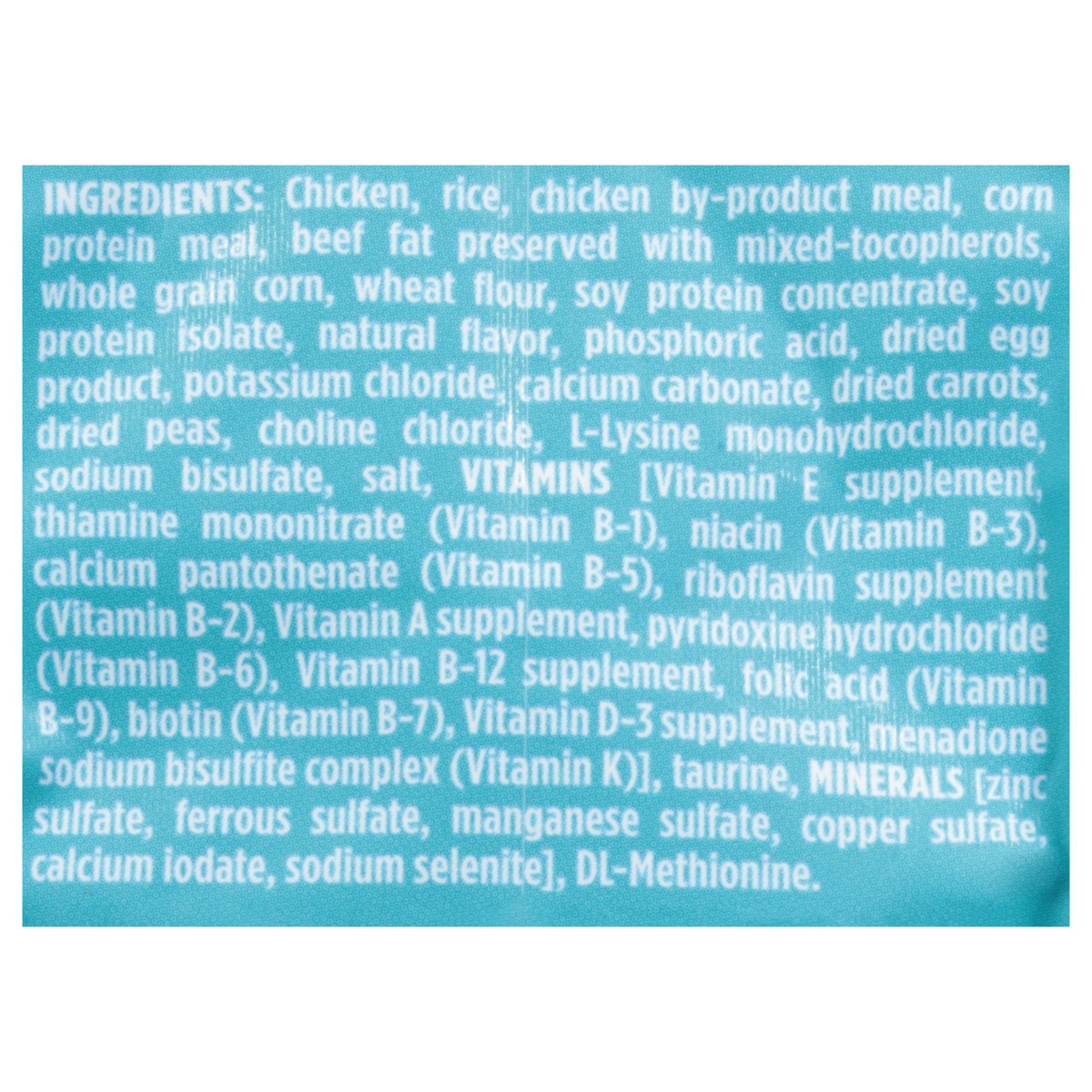 Chicken, Rice, Chicken By-Product Meal, Corn Protein Meal, Beef Fat Preserved with Mixed-Tocopherols, Whole Grain Corn, Wheat Flour, Soy Protein Concentrate, Soy Protein Isolate, Natural Flavor, Phosp…
