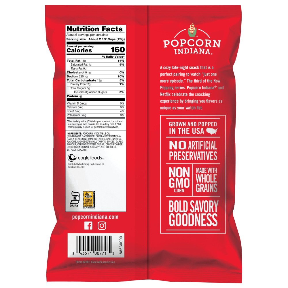 Popcorn, Vegetable Oil (Sunflower, Safflower, Corn and/or Canola), Ramen Seasoning [Maltodextrin, Salt, Natural Flavors, Monosodium Glutamate, Spices, Garlic Powder, Carrot Powder, Sugar, Onion Powder…