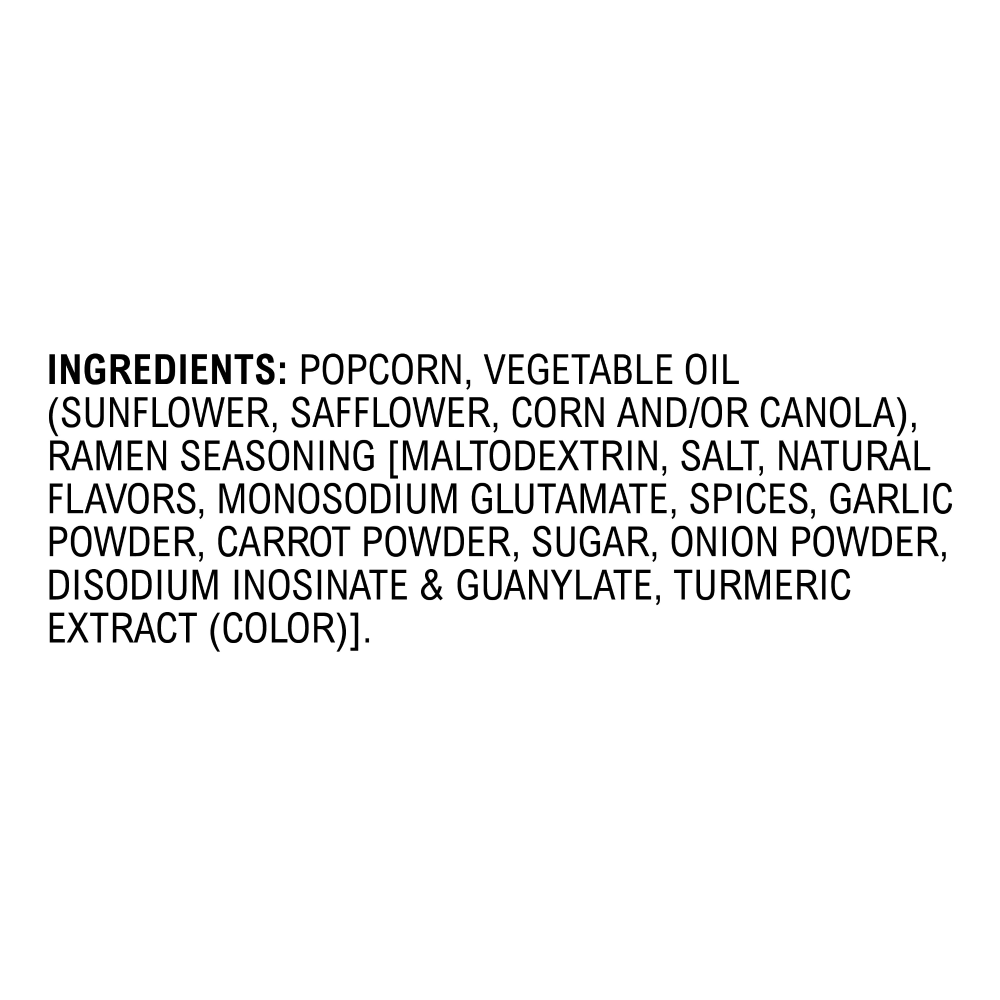 Popcorn, Vegetable Oil (Sunflower, Safflower, Corn and/or Canola), Ramen Seasoning [Maltodextrin, Salt, Natural Flavors, Monosodium Glutamate, Spices, Garlic Powder, Carrot Powder, Sugar, Onion Powder…