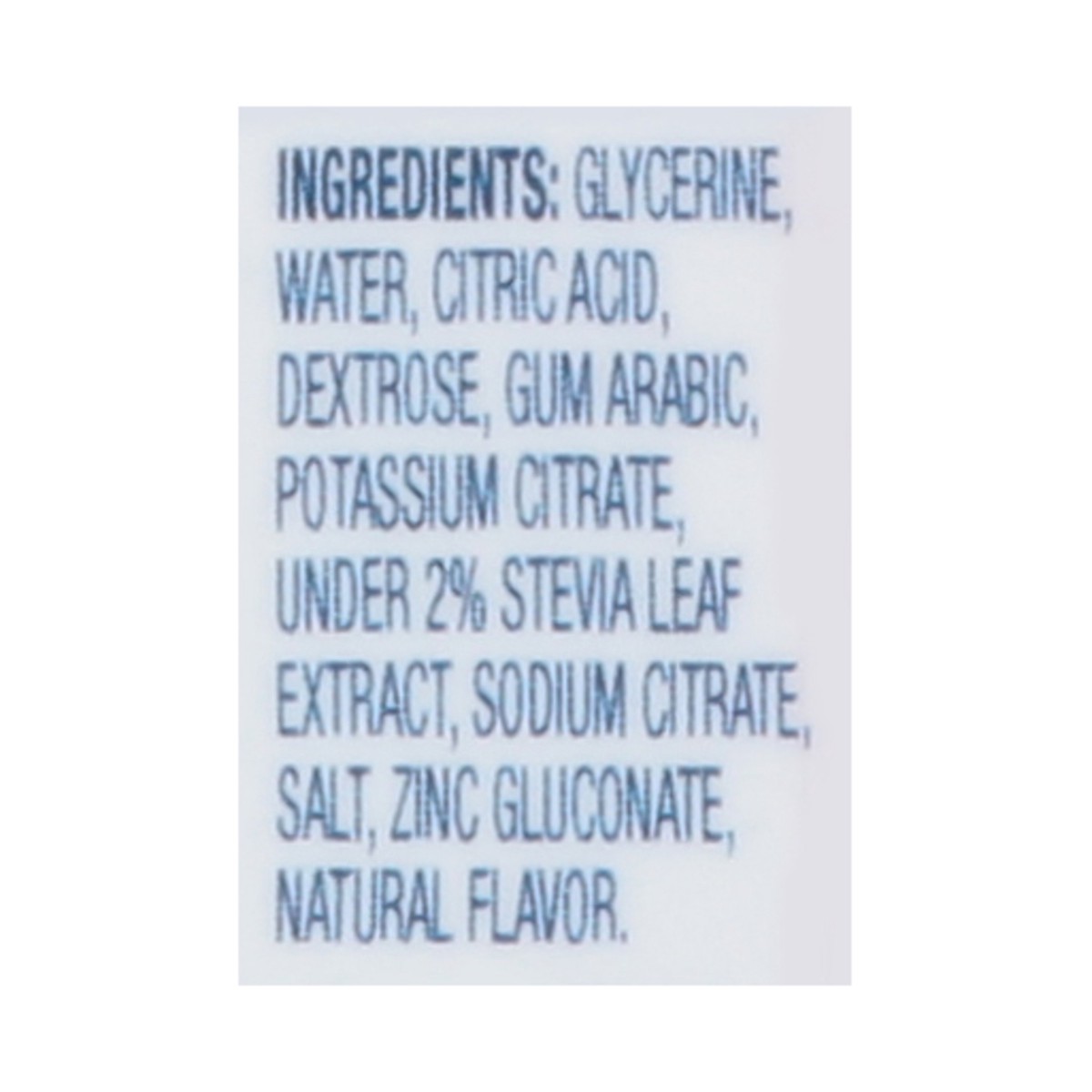 Glycerine, Water, Citric Acid, Dextrose, Gum Arabic, Potassium Citrate, Under 2% Stevia Leaf Extract, Sodium Citrate, Salt, Zinc Gluconate, Natural Flavor.