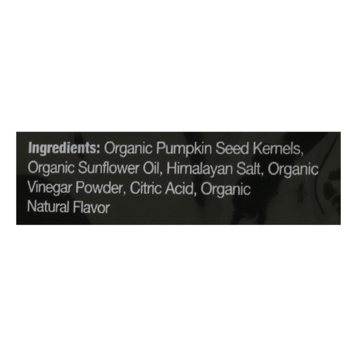 Organic Pumpkin Seed Kernels, Organic Sunflower Oil, Sea Salt, Organic Vinegar Powder (Organic Rice Maltodextrin, Organic White Distilled Vinegar), Organic Natural Flavor, Citric Acid.