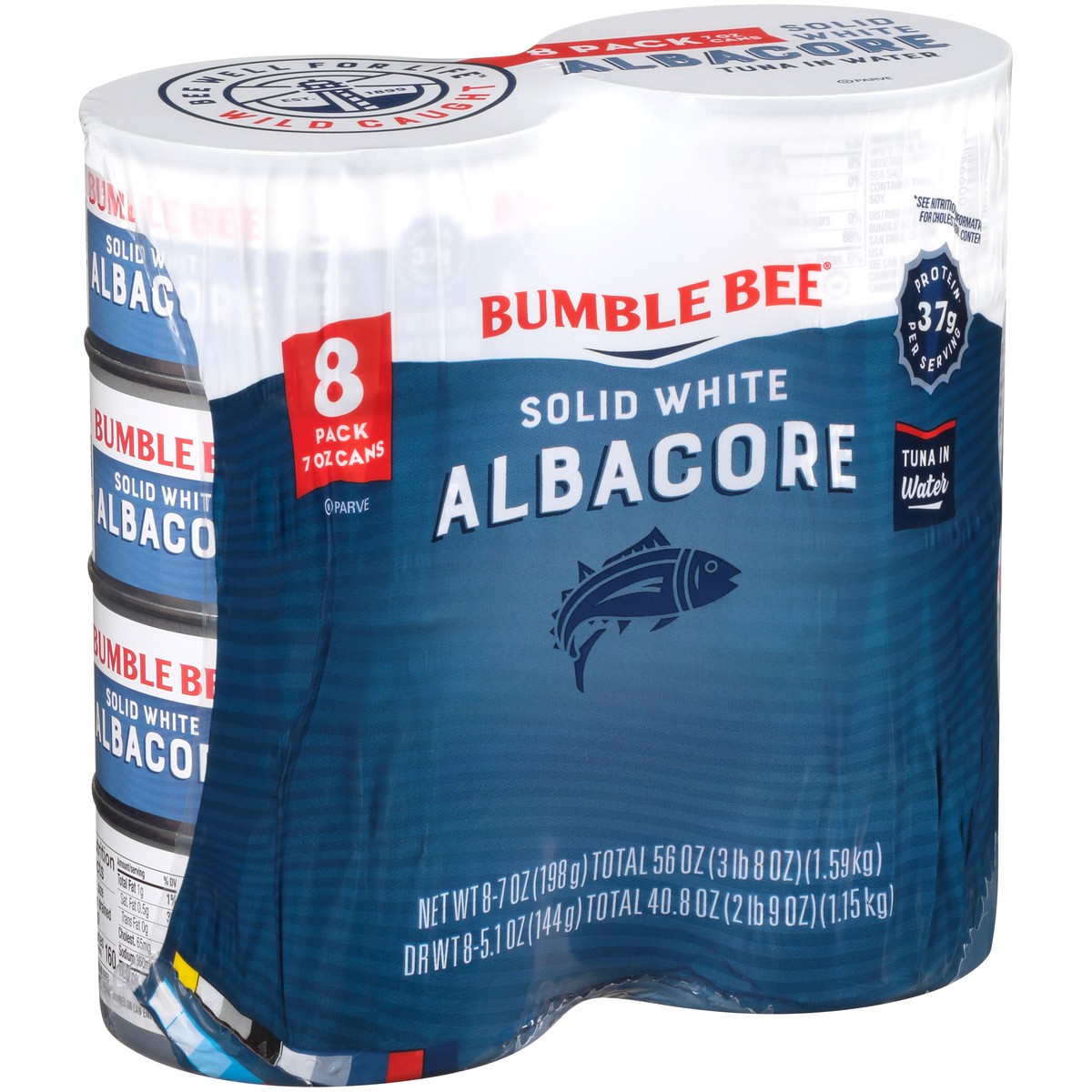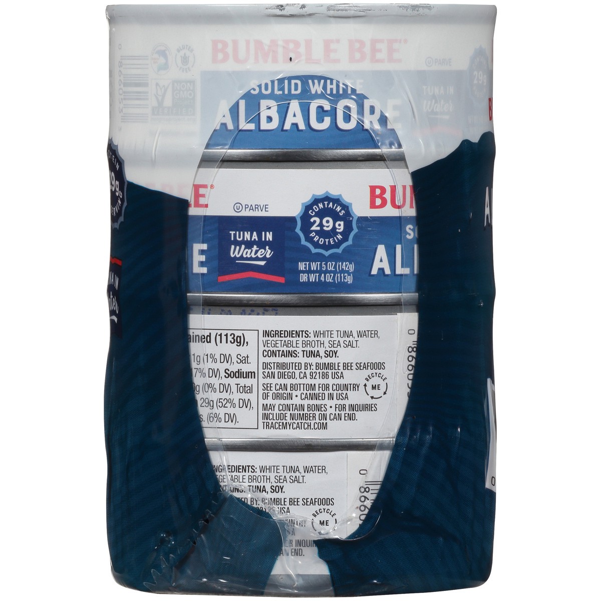 29 g protein per serving. Non GMO Project Verified. nongmoproject.org. Made with sea salt. Dolphin safe. Wild caught. Bee well for life. bumblebee.com. nongmoproject.org. Recycle me. Canned in USA.