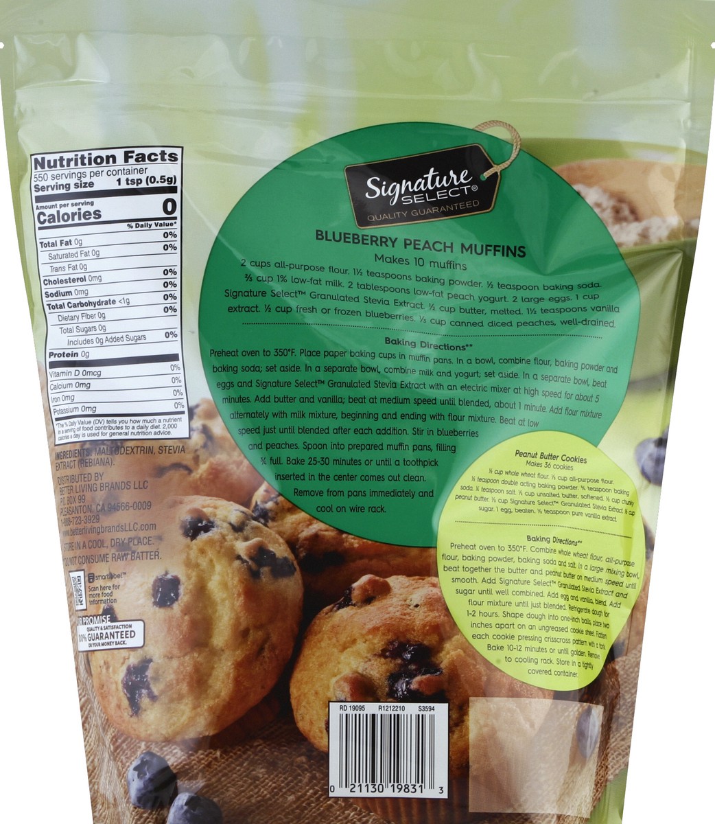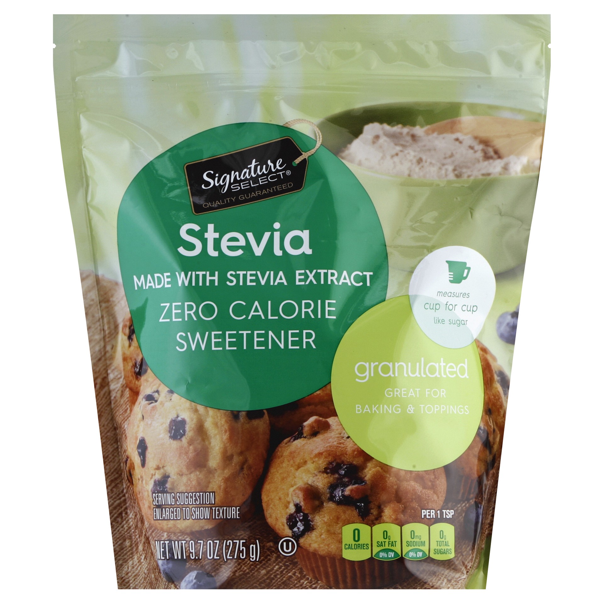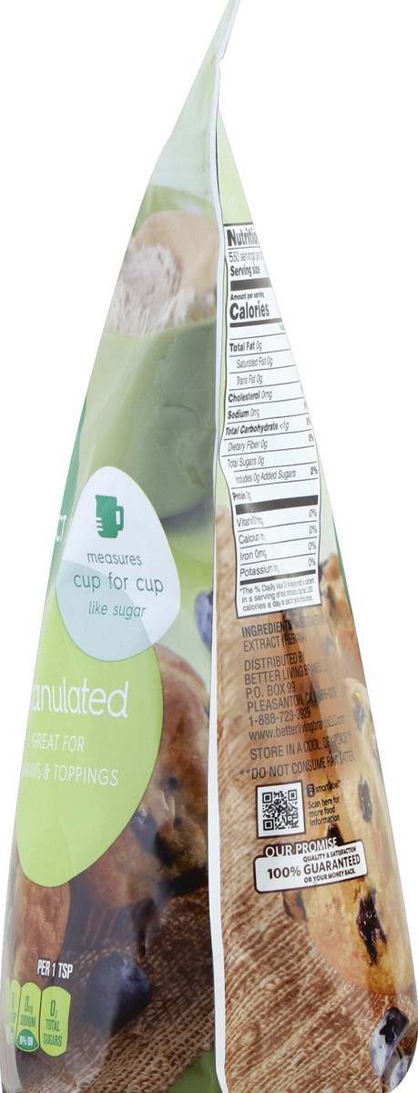 Made with stevia extract. Quality guaranteed. Measures cup for cup like sugar. Granulated great for baking & toppings. Zero calorie sweetener. Per 1 tsp: 0 calories; 0 g sat fat (0% DV); 0 mg sodium (…