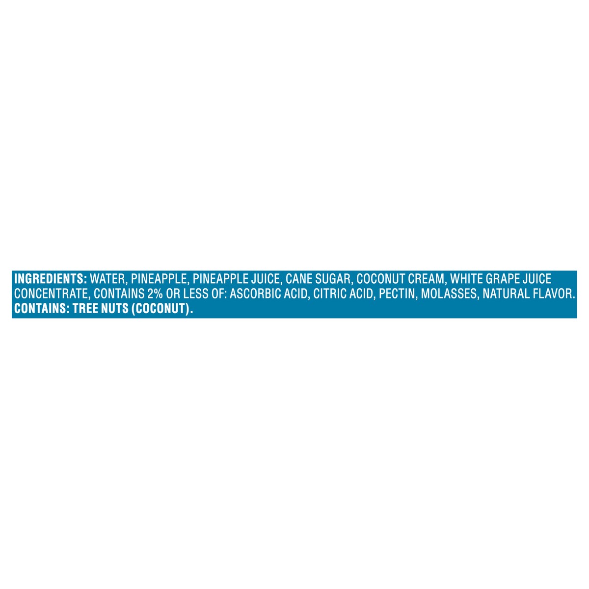 Water, Pineapple, Pineapple Juice, Cane Sugar, Coconut Cream, White Grape Juice Concentrate, Contains 2% or Less of: Ascorbic Acid, Citric Acid, Pectin, Molasses, Natural Flavor.