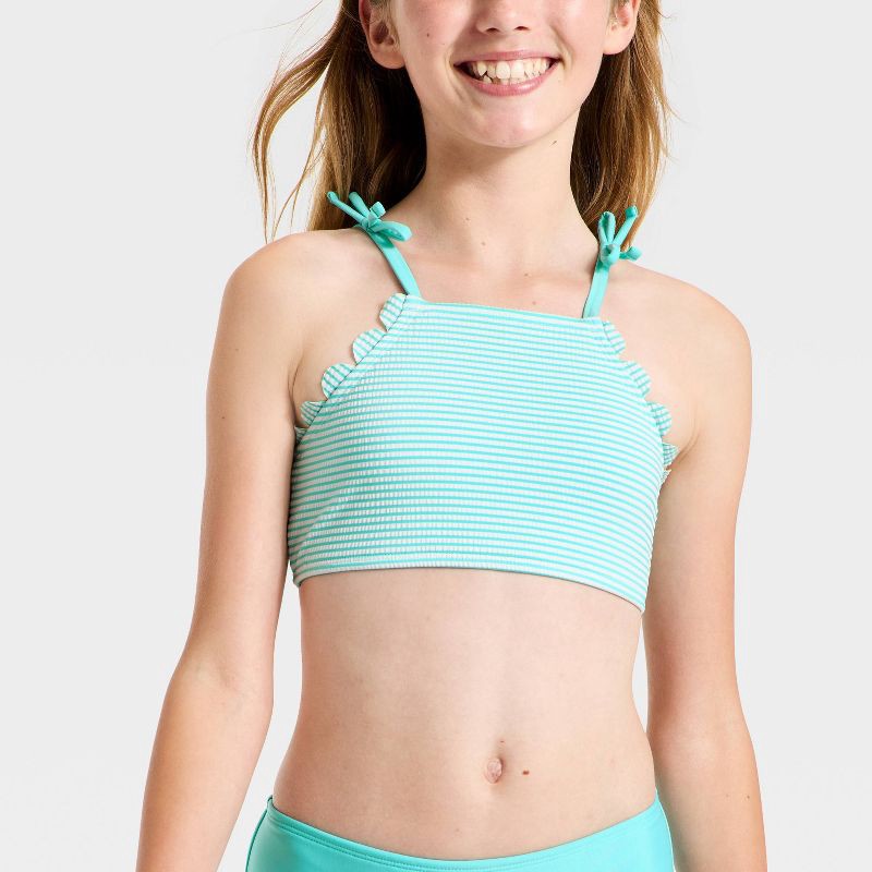 Freshen up their swimwear collection with this Scallop Seersucker Bikini Set from Cat & Jack™. This two-piece set is crafted from recycled polyester, nylon and spandex blend seersucker fabric and feat…