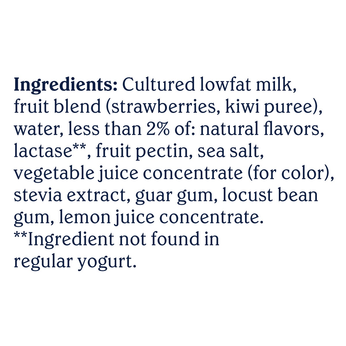 Cultured Lowfat Milk, Fruit Blend (Strawberries, Kiwi Puree), Water, Less than 2% of: Natural Flavors, Lactase**, Fruit Pectin, Sea Salt, Vegetable Juice Concentrate (for Color), Stevia Extract, Guar …