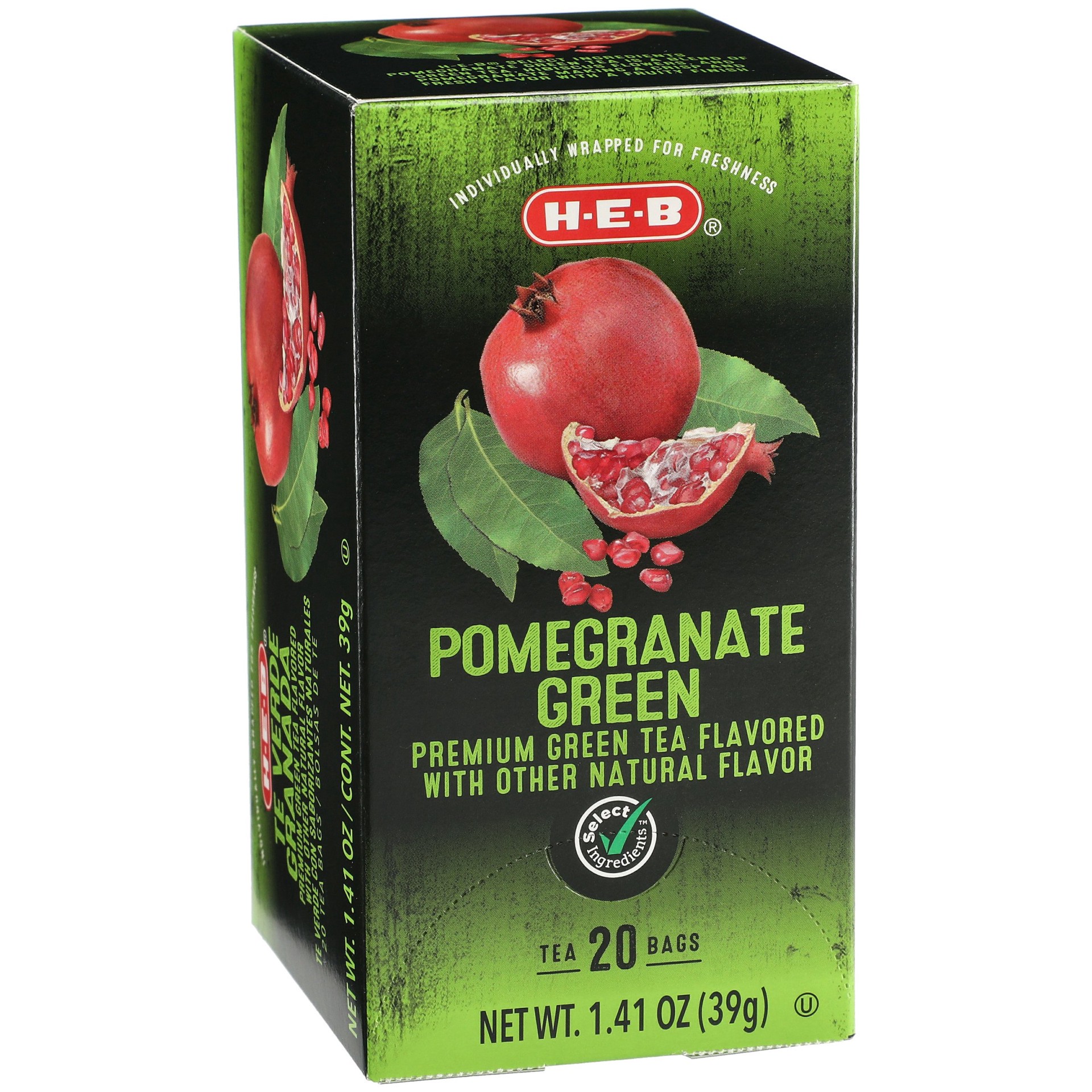 H-E-B Select Ingredients Pomegranate Green Tea Bags About H-E-B Select Ingredients: We take pride in our products and believe what we put IN is just as important as what we leave OUT. That's why our …