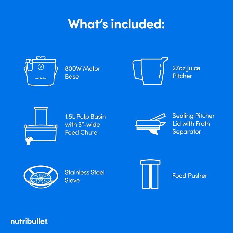 - What's Included The nutribullet Juicer™ comes with (1) 800W Motor Base, (1) 1.5L Pulp Basin with 3” wide feed chute, (1) Stainless Steel Sieve, (1) 27oz Juice Pitcher (1) Sealing pitcher lid with froth separator, (1) Food Pusher, (1) Cleaning Brush and User & Recipe Guides