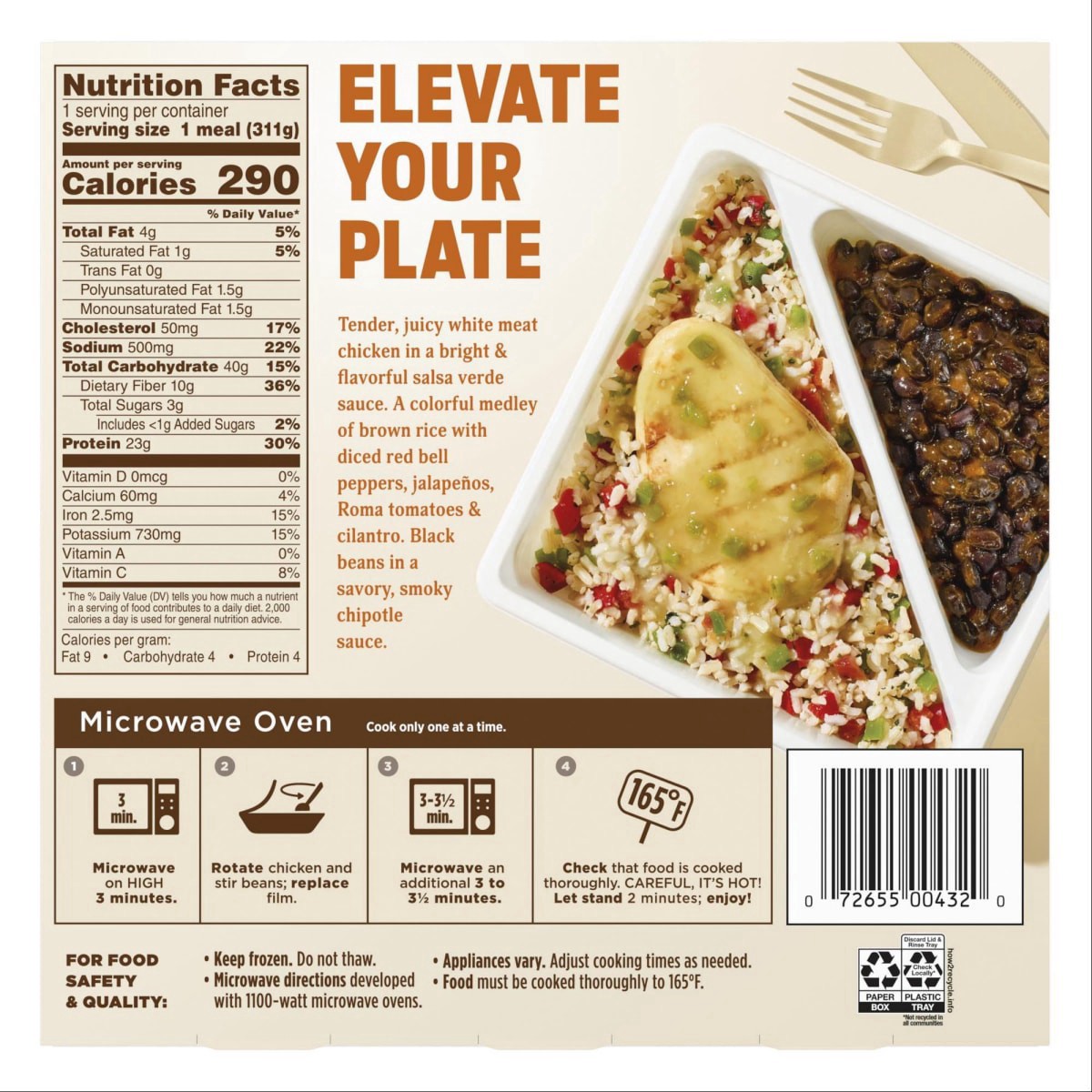 - Frozen entrée made with white meat chicken in a salsa verde sauce over brown rice