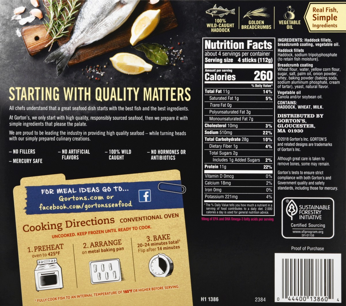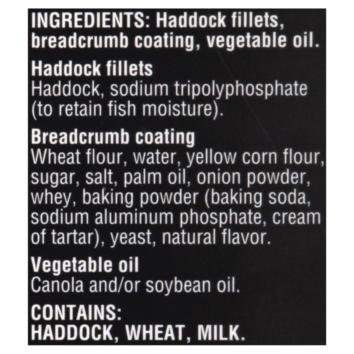HADDOCK FILLETS, BREADCRUMB COATING, CANOLA OIL. HADDOCK FILLETS: HADDOCK, SODIUM TRIPOLYPHOSPHATE (TO RETAIN FISH MOISTURE). BREADCRUMB COATING: WHEAT FLOUR, WATER, YELLOW CORN FLOUR, SUGAR, SALT APL…