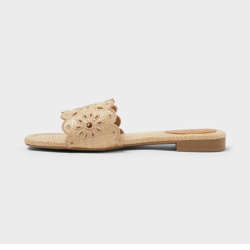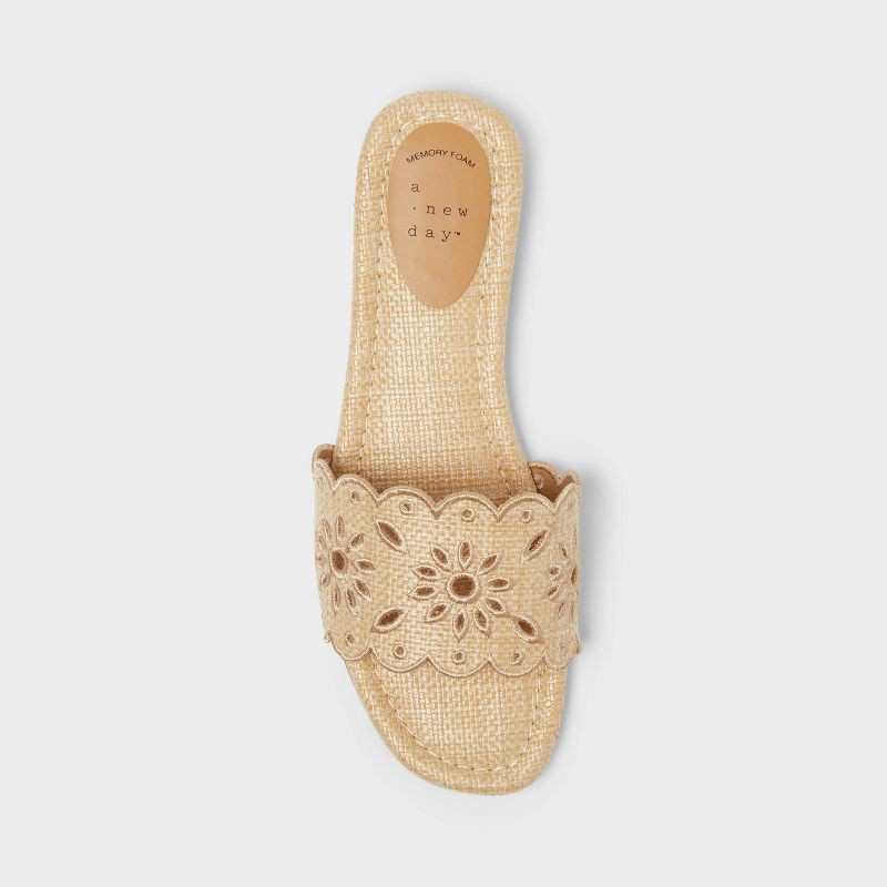 Complete your ensemble for a fun day out with these Cecile Slide Sandals from A New Day™. These sandals feature a single wide band showcasing intricate floral cutouts for a sweet look. The slip-on des…