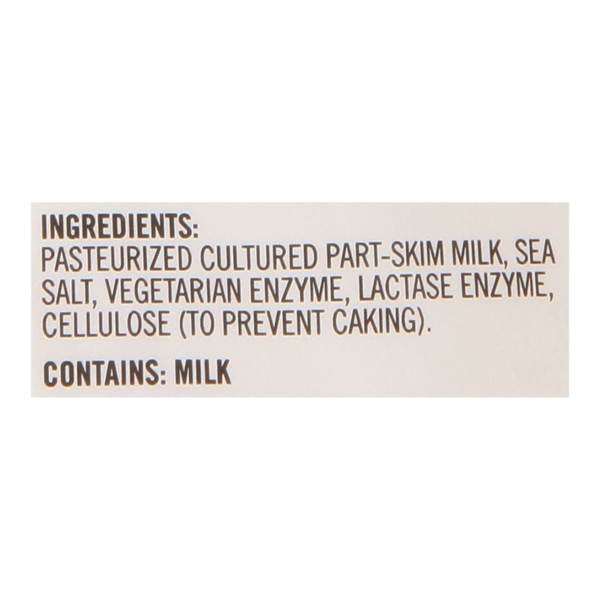 Pasteurized Cultured Part-Skim Milk, Sea Salt, Vegetarian Enzyme, Lactase Enzyme, Cellulose (to Prevent Caking).