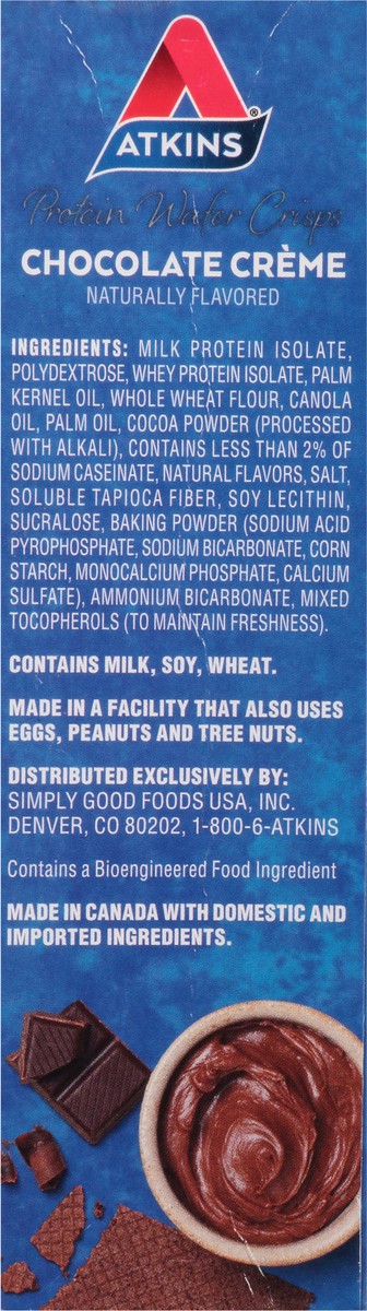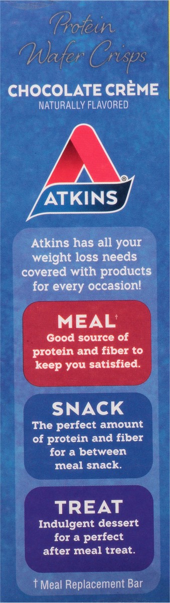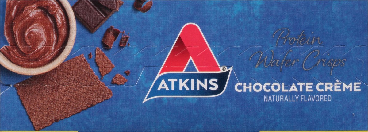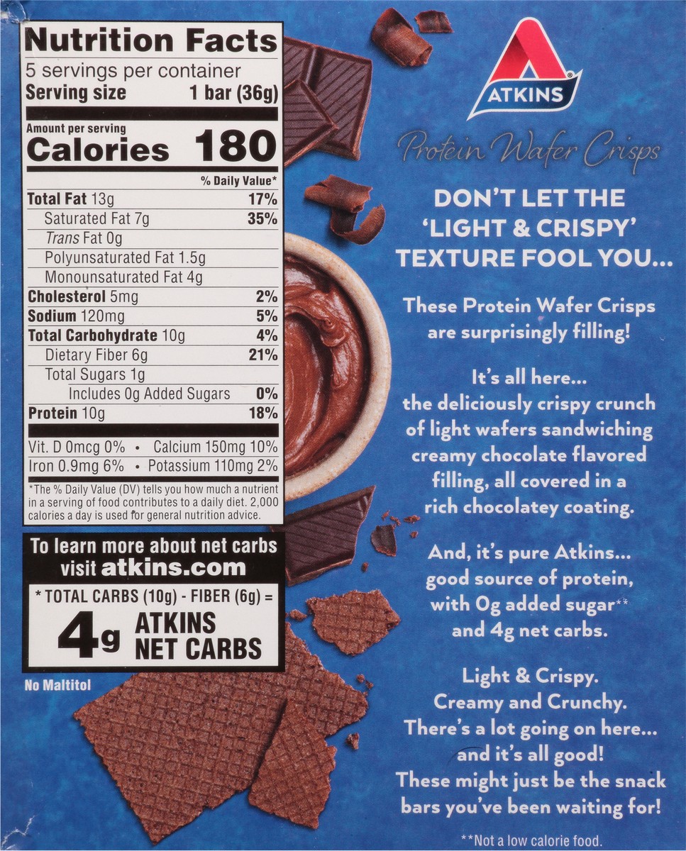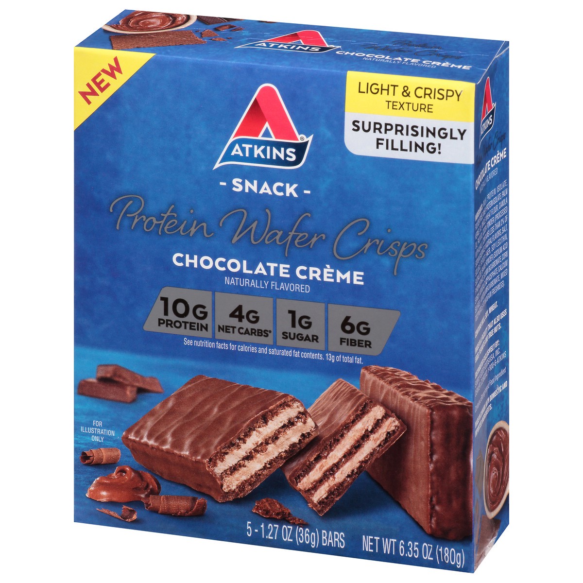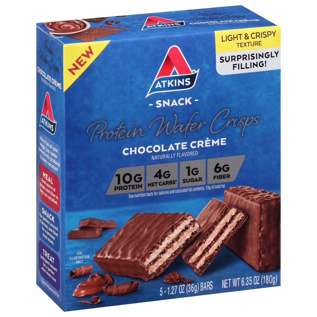 - AT HOME OR ON-THE-GO. Atkins Chocolate Crème Protein Wafer Crisps. Enjoy delicious wafer crisps that fit right into your busy schedule, with 10g of protein, 4g of net carbs, and 1g of sugar per serving*. This is Today’s Atkins™.