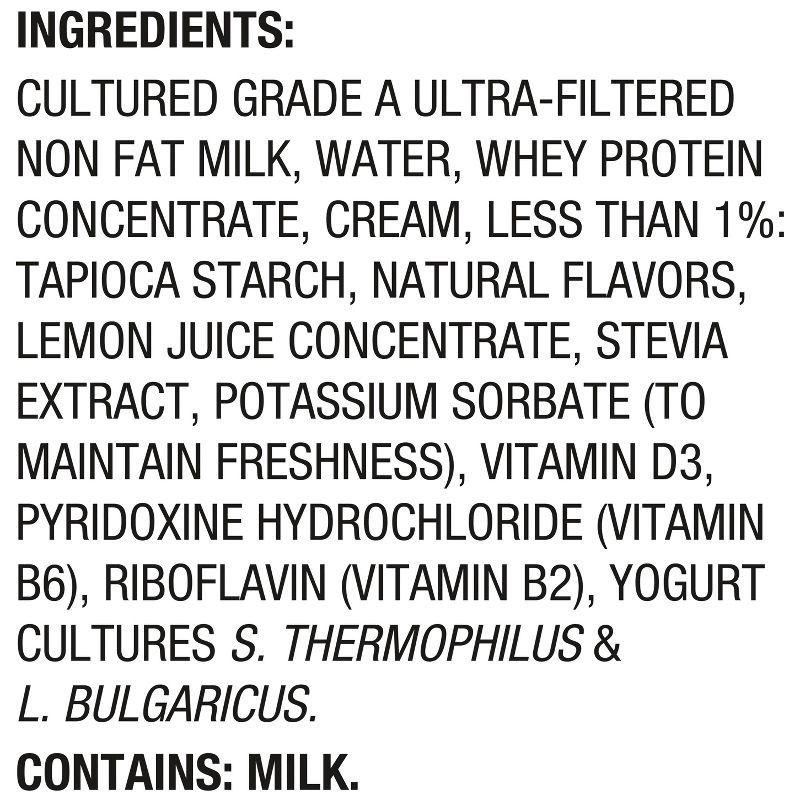 Cultured Grade A Ultra-Filtered Non Fat Milk, Water, Whey Protein Concentrate, Cream, Less than 1%: Tapioca Starch, Natural Flavors, Lemon Juice Concentrate, Stevia Extract, Potassium Sorbate (to Main…