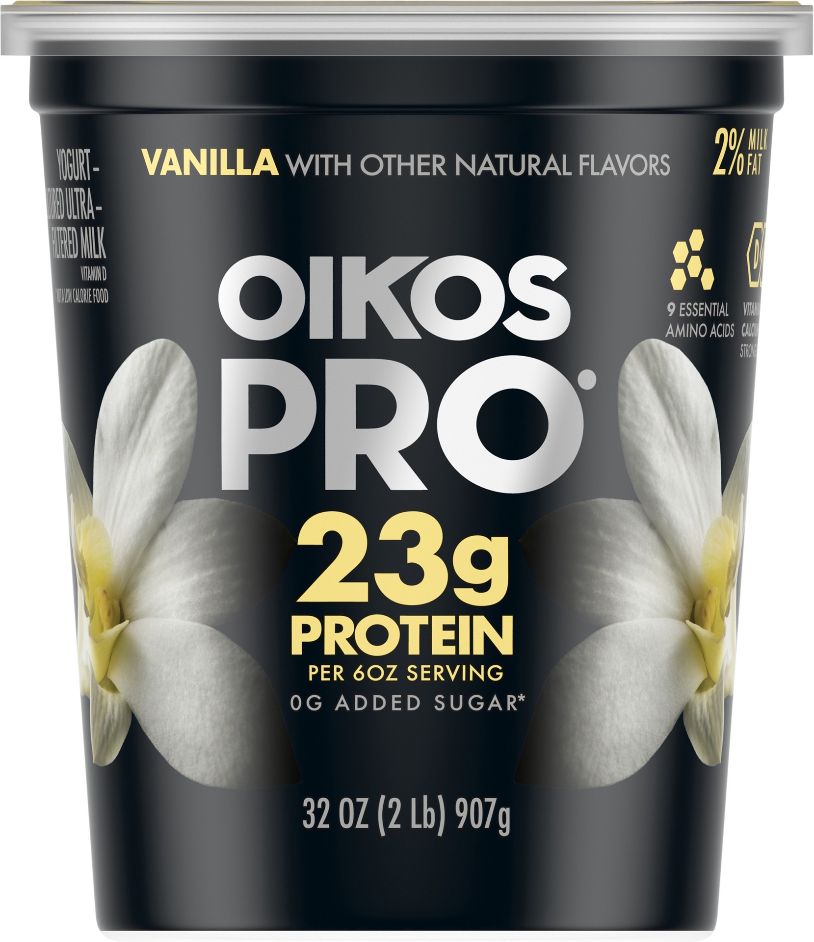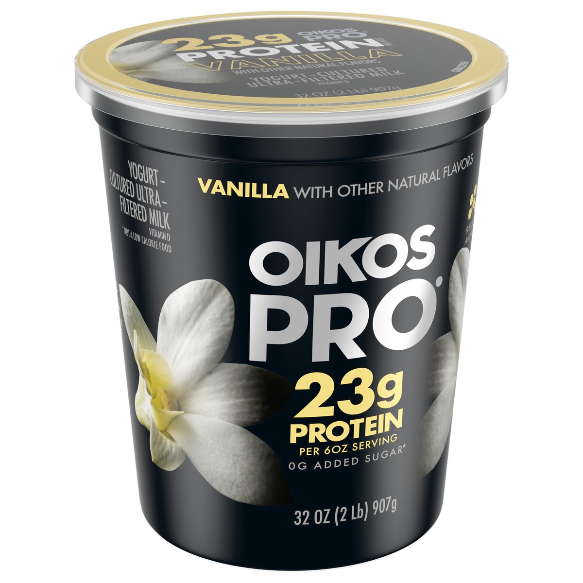 Go Pro with Oikos Pro Vanilla Yogurt-Cultured Ultra-Filtered Milk Product, the spoon-able high protein snack with more of what you want, and less of what you don''t. Every 6 oz serving contains 0g add…