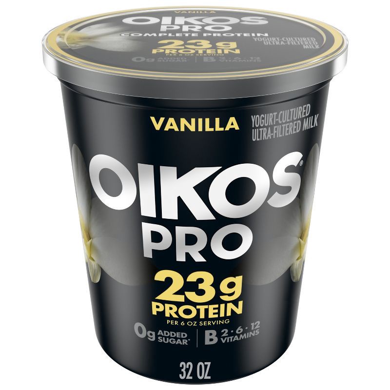 - Stronger Makes Everything Better: One 32 oz tub of Oikos Pro Vanilla Yogurt-Cultured Ultra-Filtered Milk Product packed with B vitamins (B2, B6, B12), used by muscles to support energy production
