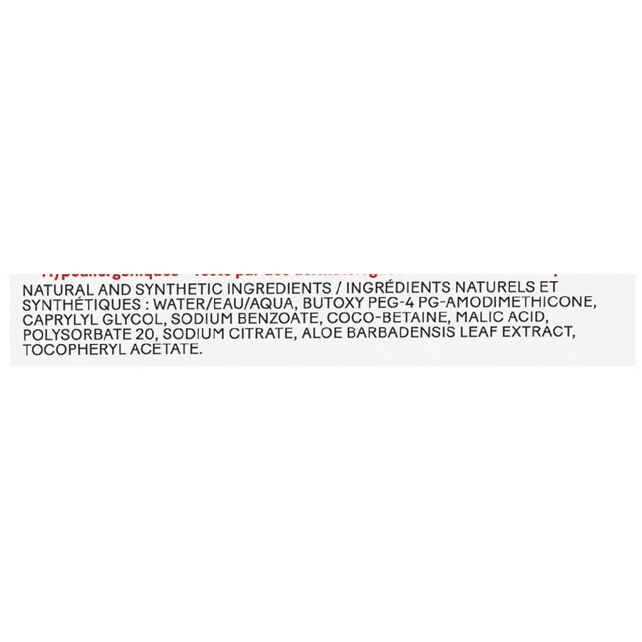 Natural and Synthetic Ingredients: Water/Eau/Aqua, Butoxy PEG-4 PG-Amodimethicone, Caprylyl Glycol, Sodium Benzoate, Coco-Betaine, Malic Acid, Polysorbate 20, Sodium Citrate, Aloe Barbadensis Leaf Ext…