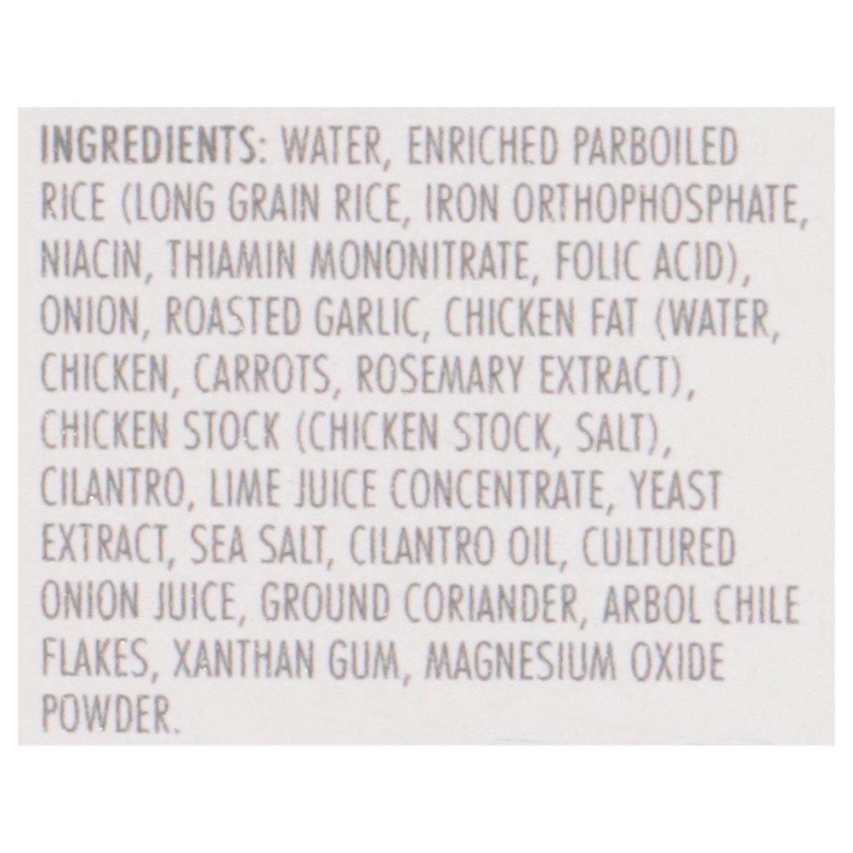 Water, Enriched Parboiled Rice (Long Grain Rice, Iron Orthophosphate, Niacin, Thiamin Mononitrate, Folic Acid), Onion, Roasted Garlic, Chicken Fat (Water, Chicken, Carrots, Rosemary Extract), Chicken …