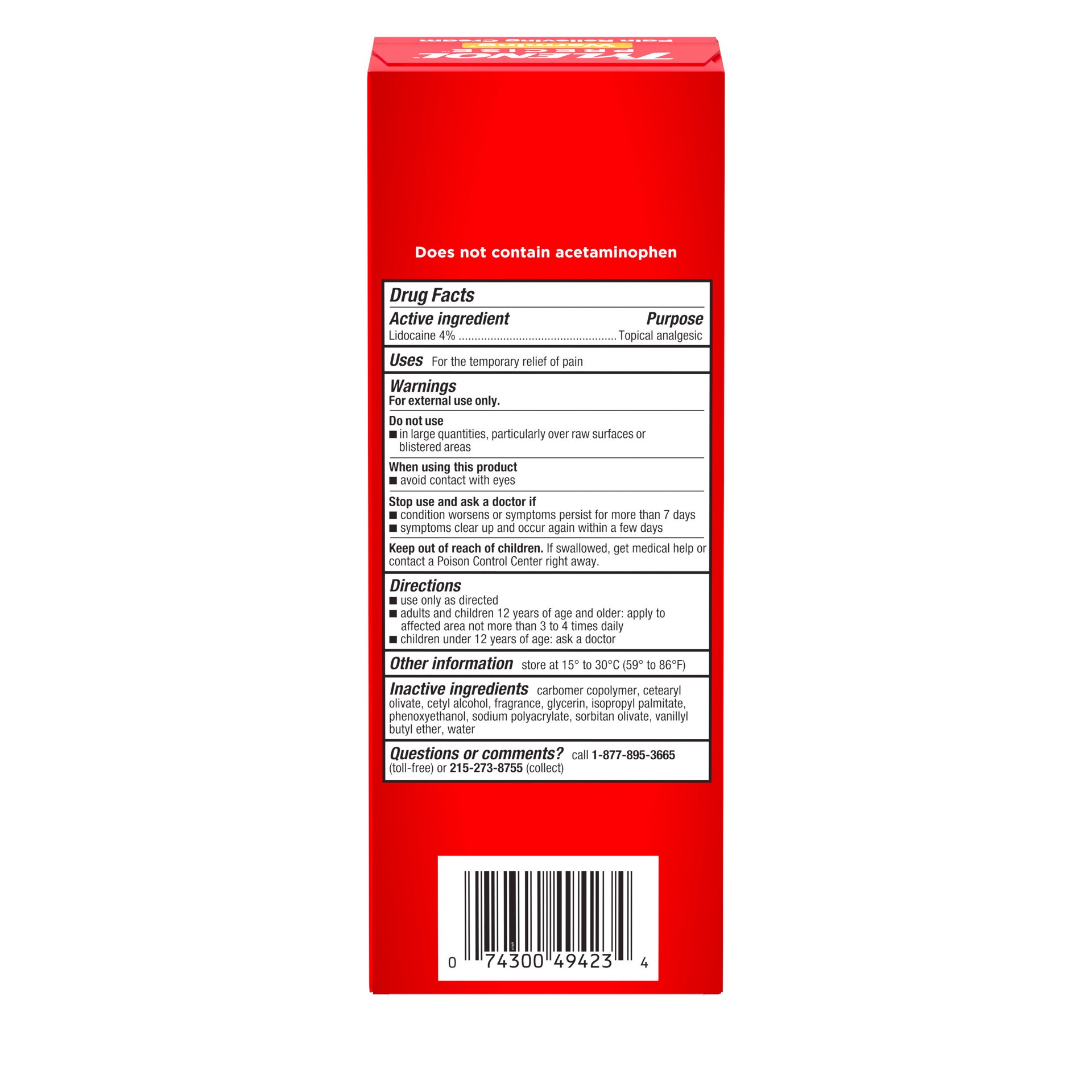 Active Ingredients: Lidocaine (4 %), Topical Analgesic. Inactive Ingredients: Carbomer Copolymer, Cetearyl Olivate, Cetyl Alcohol, Fragrance, Glycerin, Isopropyl Palmitate, Phenoxyethanol, Sodium Poly…