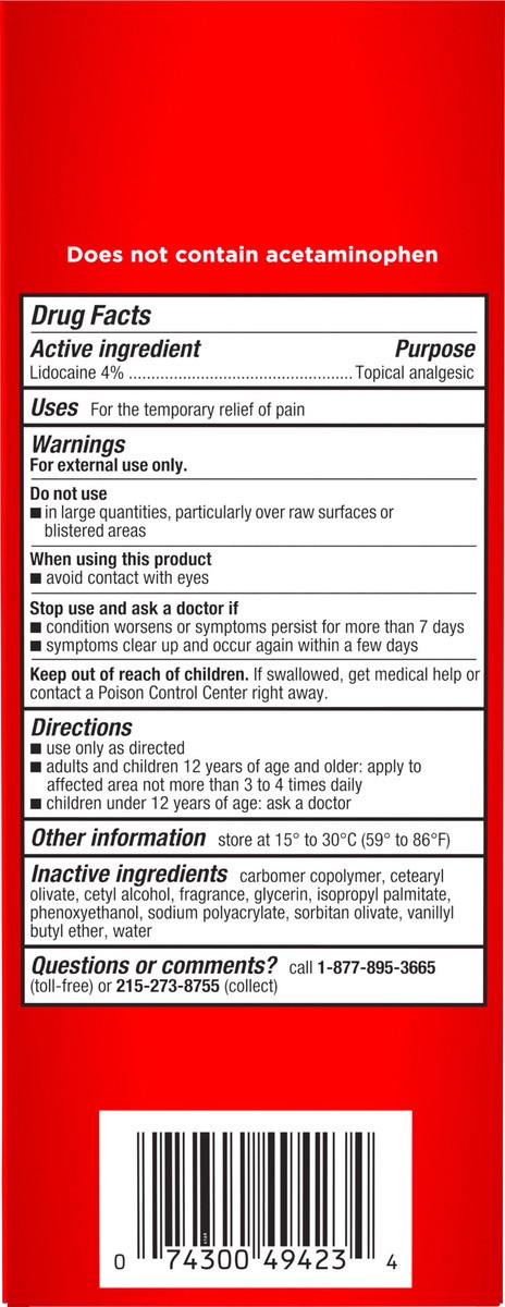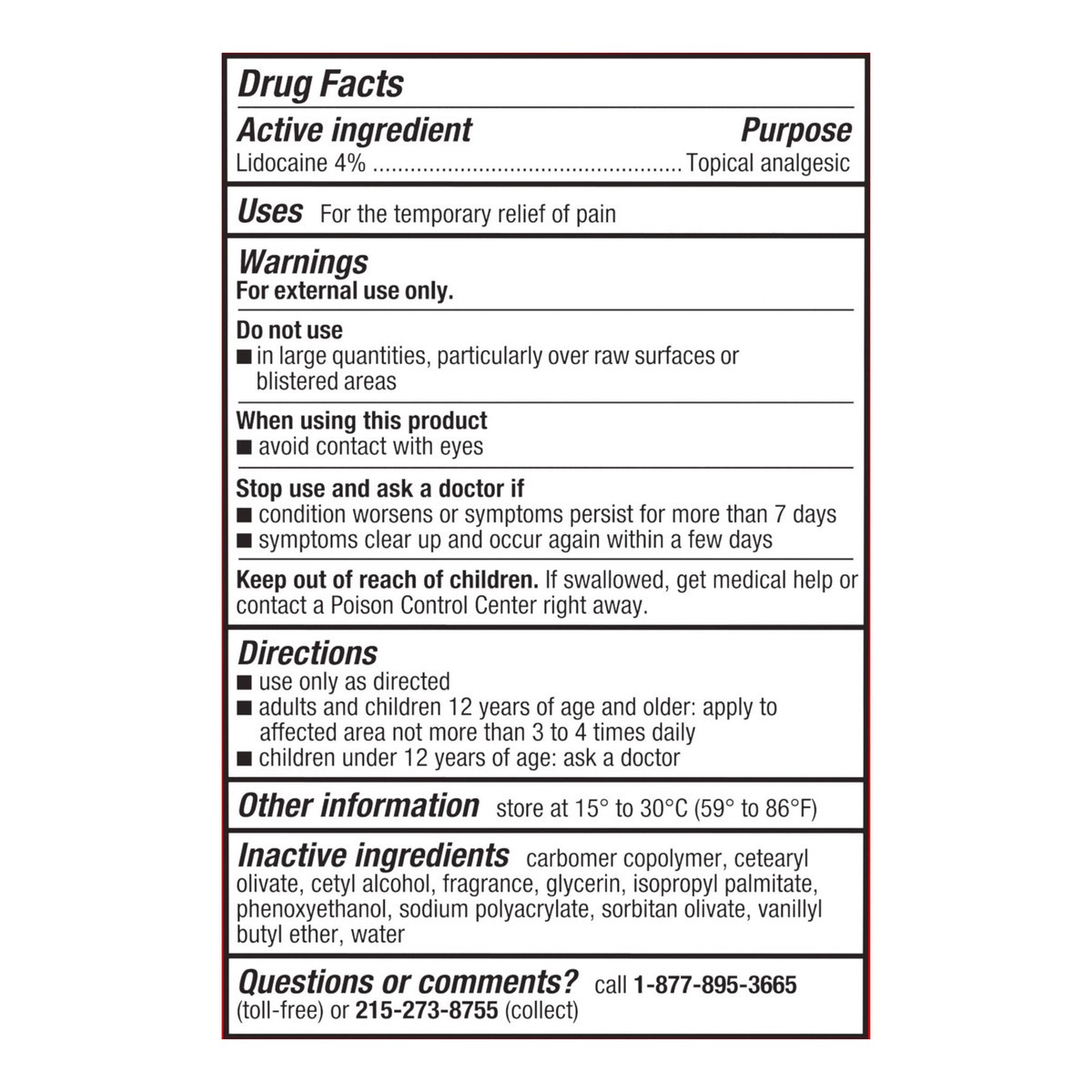 Active Ingredients: Lidocaine (4 %), Topical Analgesic. Inactive Ingredients: Carbomer Copolymer, Cetearyl Olivate, Cetyl Alcohol, Fragrance, Glycerin, Isopropyl Palmitate, Phenoxyethanol, Sodium Poly…