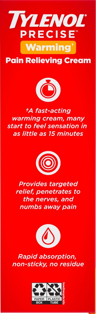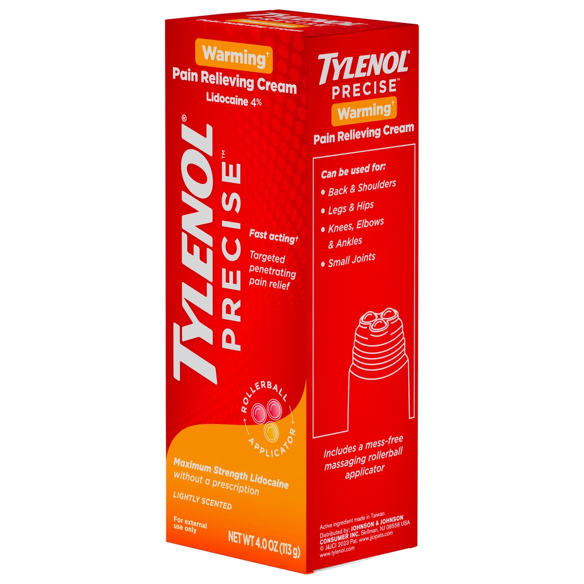 - Tylenol Precise Warming Pain Relieving Cream for fast-acting joint and muscle pain reliefWarming pain reliever provides penetrating pain relief to help numb minor joint & muscle sorenessTopical analgesic with maximum strength 4% lidocaine without a prescription for pain reliefPenetrating pain cream provides warming relief from muscle aches and painsIdeal for aches & pains in back