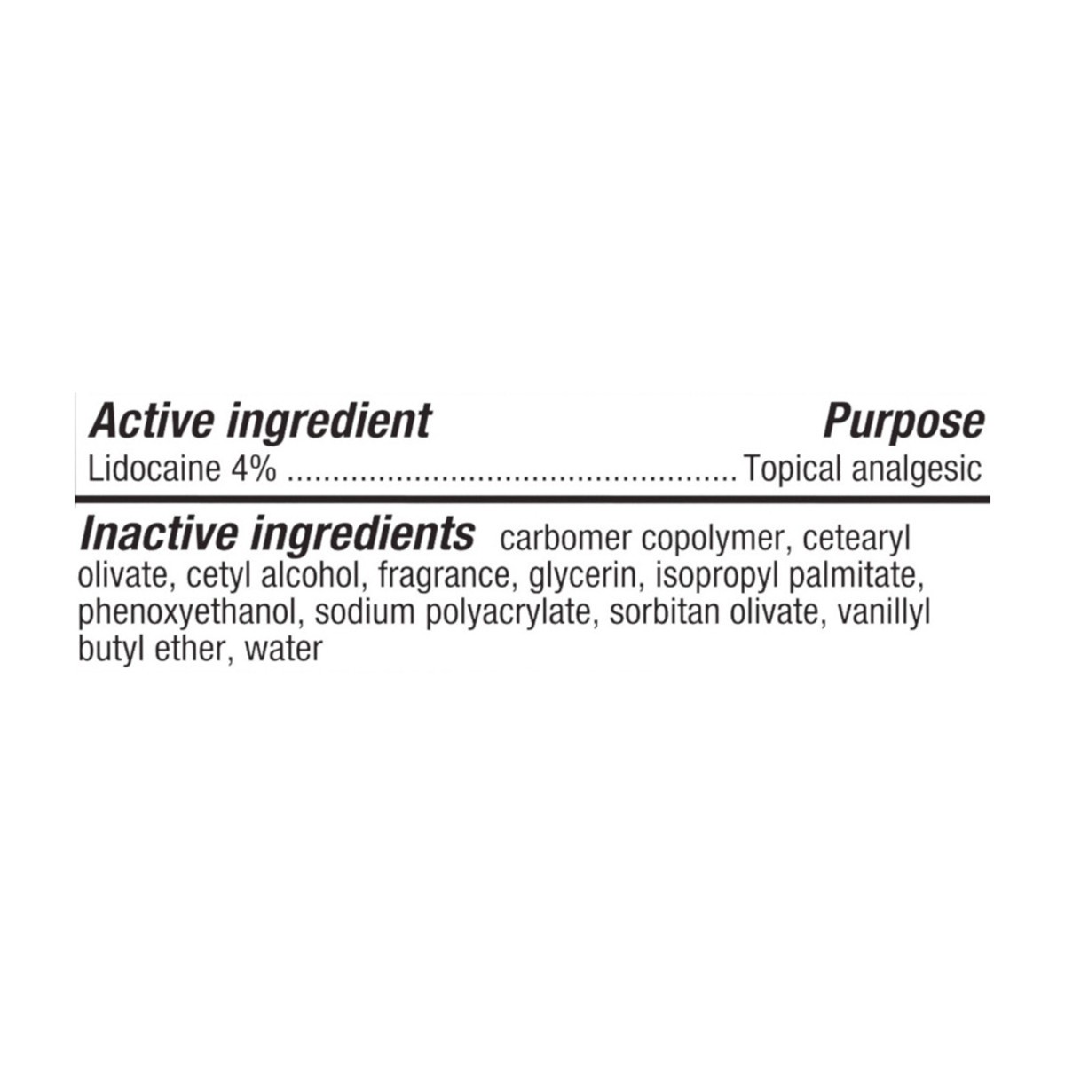 Active Ingredients: Lidocaine (4 %), Topical Analgesic. Inactive Ingredients: Carbomer Copolymer, Cetearyl Olivate, Cetyl Alcohol, Fragrance, Glycerin, Isopropyl Palmitate, Phenoxyethanol, Sodium Poly…