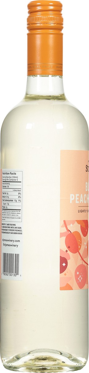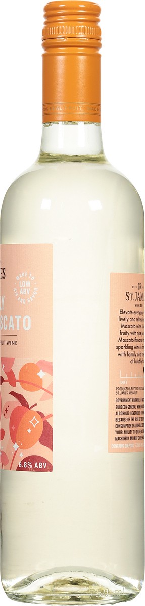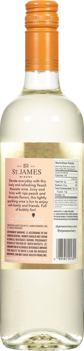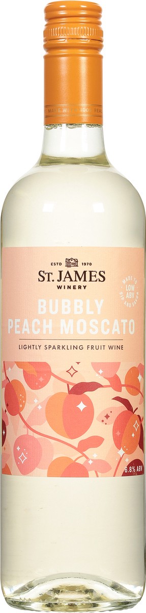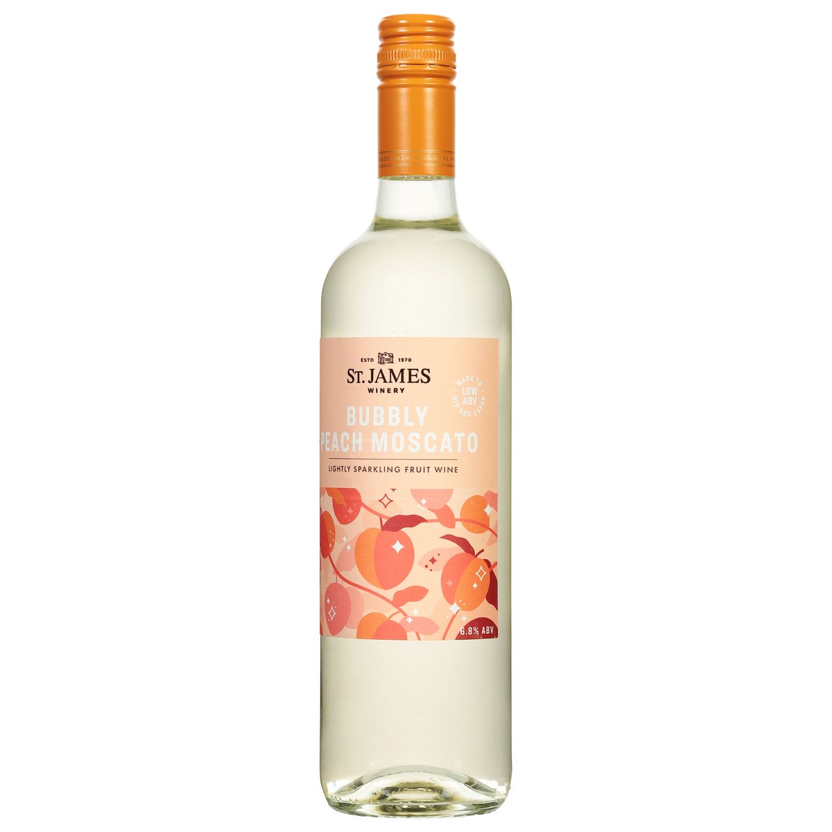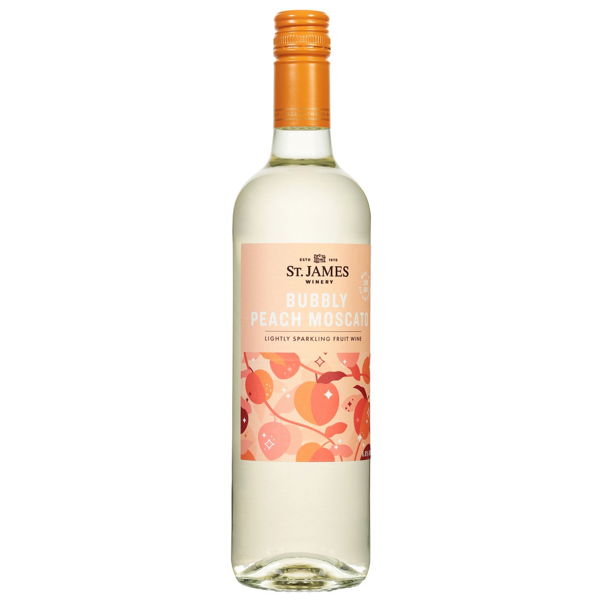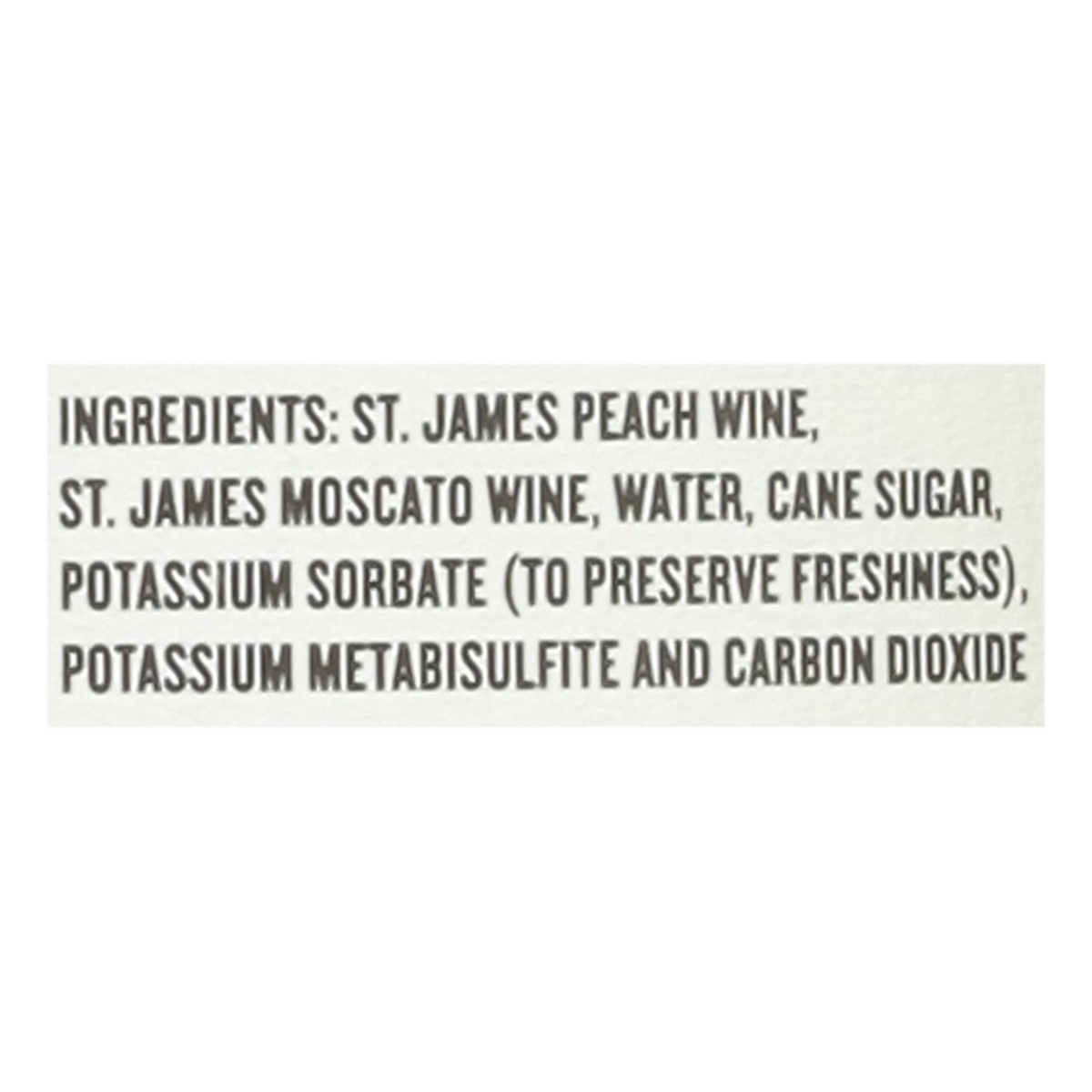 St. James Peach Wine, St, James Moscato Wine, Water, Cane Sugar Potassium Sorbate (to Preserve Freshness), Potassium Metabisulfite and Carbon Dioxide.