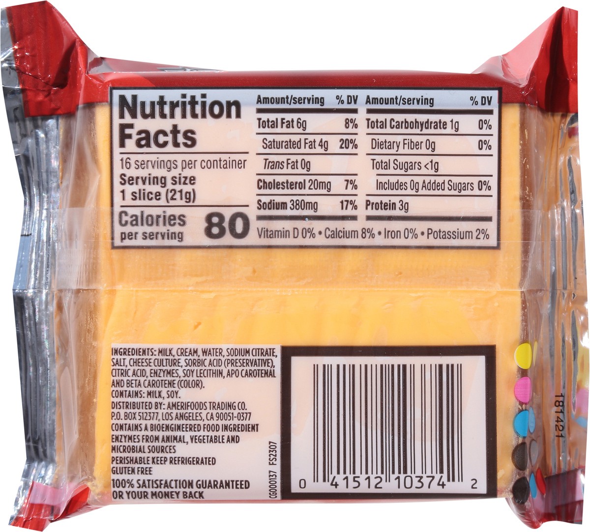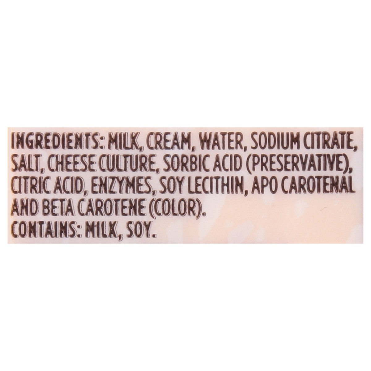 Milk, Cream, Water, Sodium Citrate, Salt, Cheese Culture, Sorbic Acid (Preservative), Citric Acid, Enzymes, Soy Lecithin, Apo Carotenal and Beta Carotene (Color).