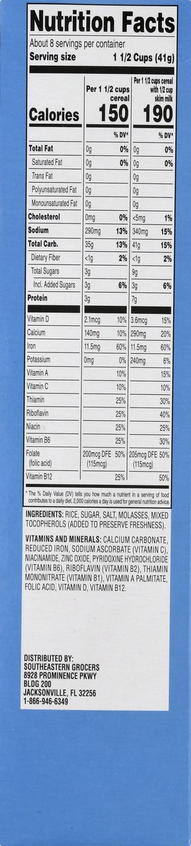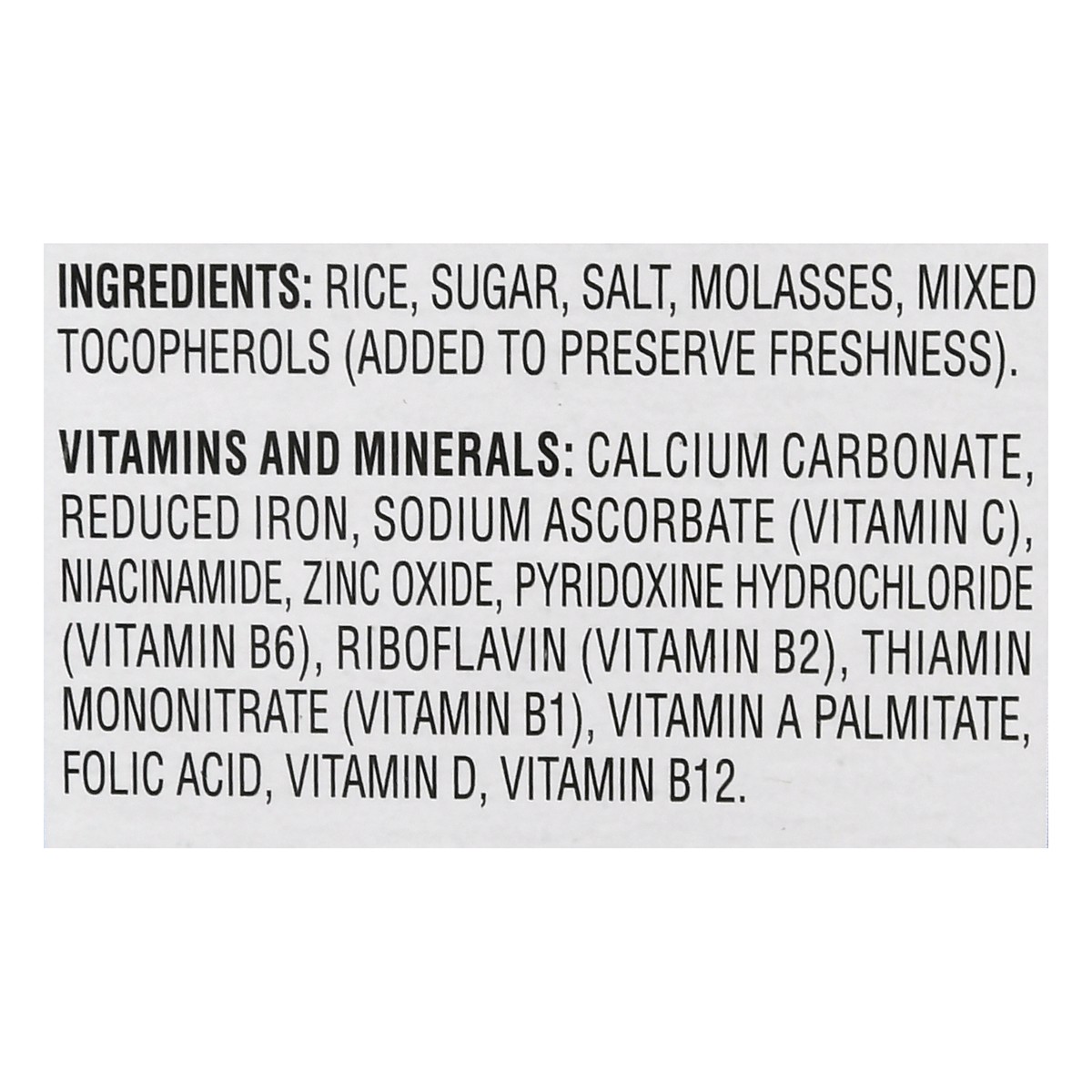 Rice , Sugar, Salt, Molasses, Mixed Tocopherols (Added to Preserve Freshness). Vitamins and Minerals: Calcium Carbonate, Reduced Iron, Sodium Ascorbate (Vitamin C), Niacinamide, Zinc Oxide, Pyridoxine…
