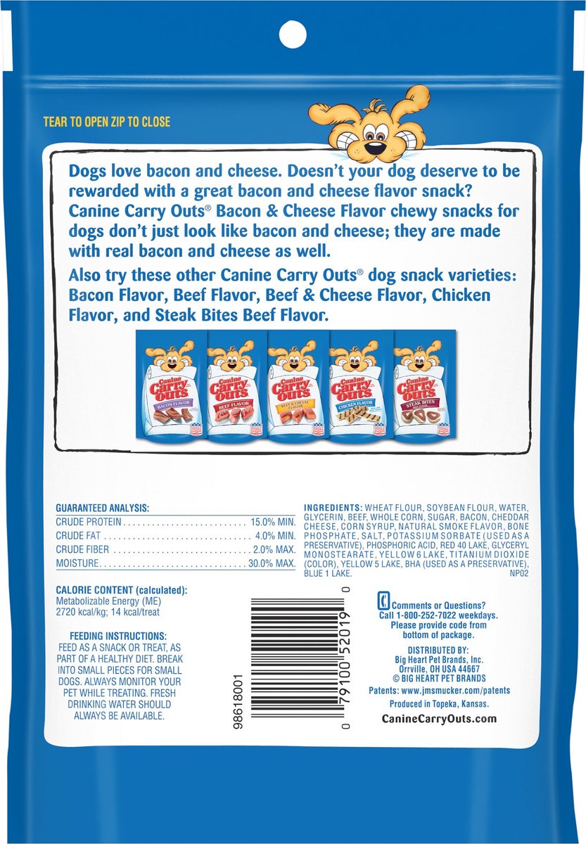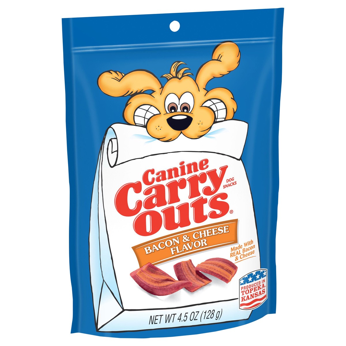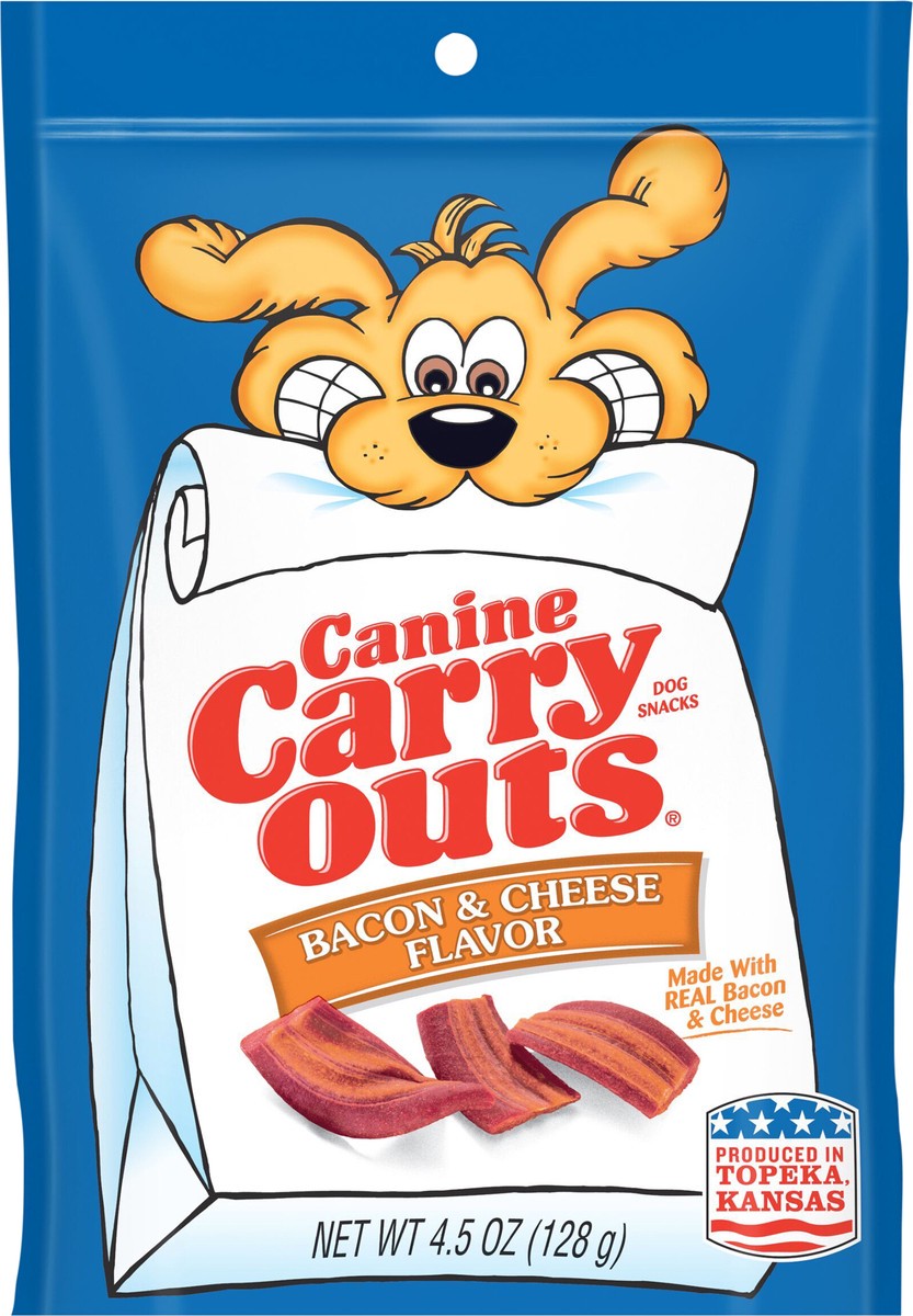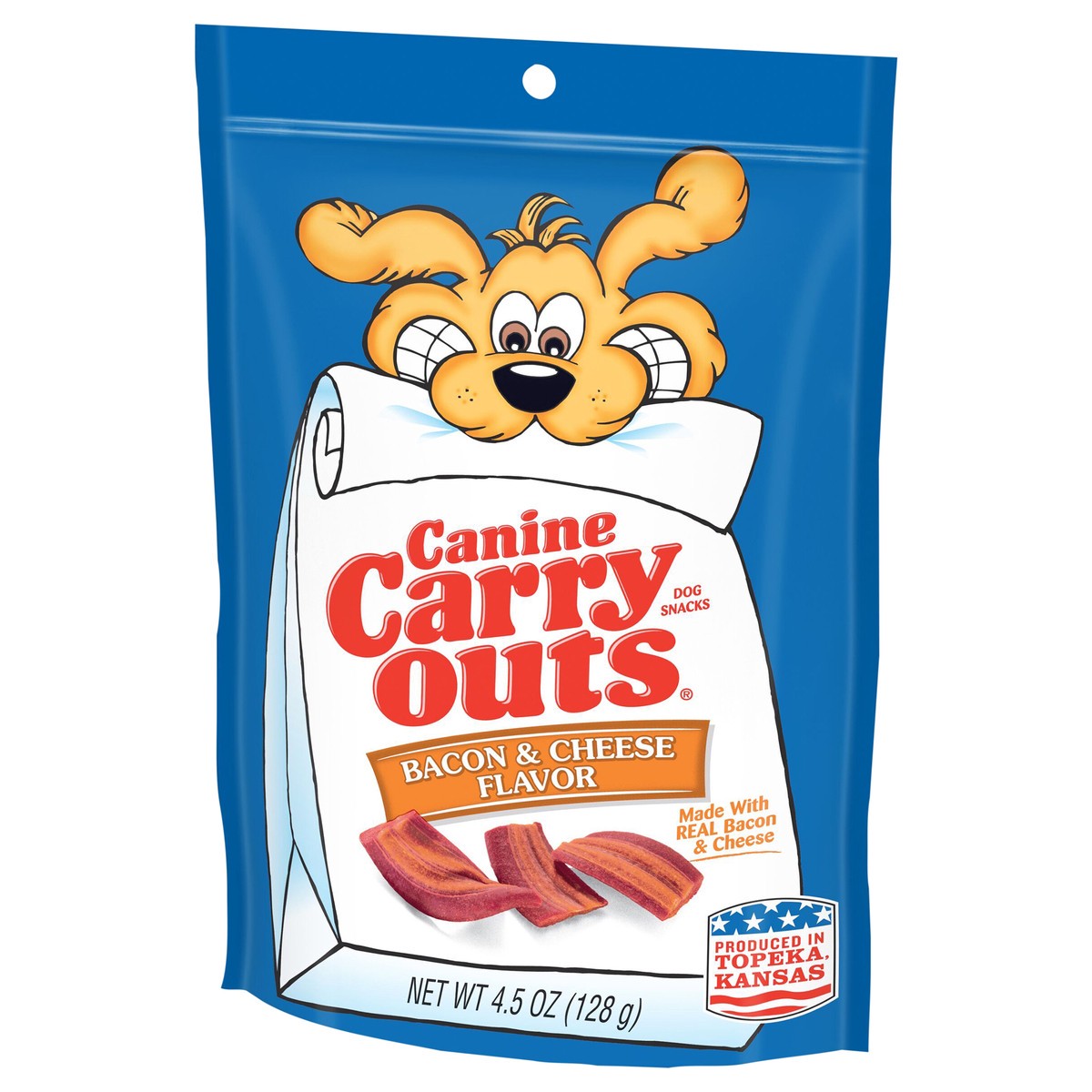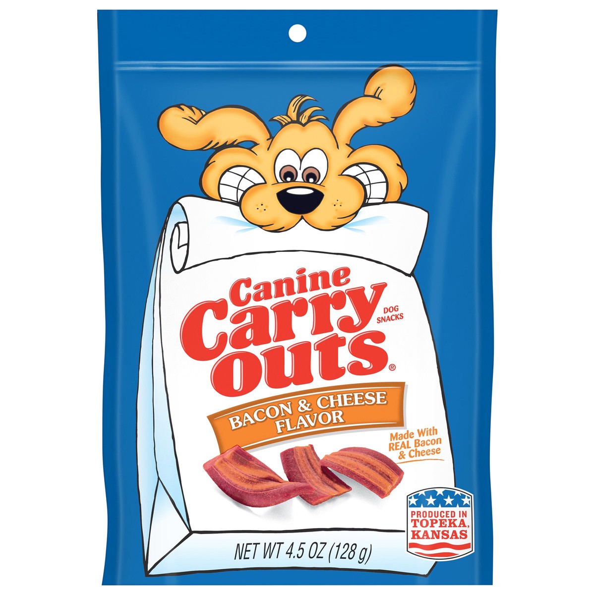 - Contains one (1) 4.5-ounce bag of Canine Carry Outs Bacon & Cheese Flavor dog treats