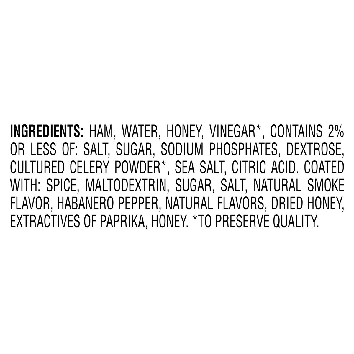 Ham, water, honey, vinegar*, contains 2% or less of: salt, sugar, sodium phosphates, dextrose, cultured celery powder*, sea salt, citric acid. Coated with: Spice, maltodextrin, sugar, salt, natural sm…