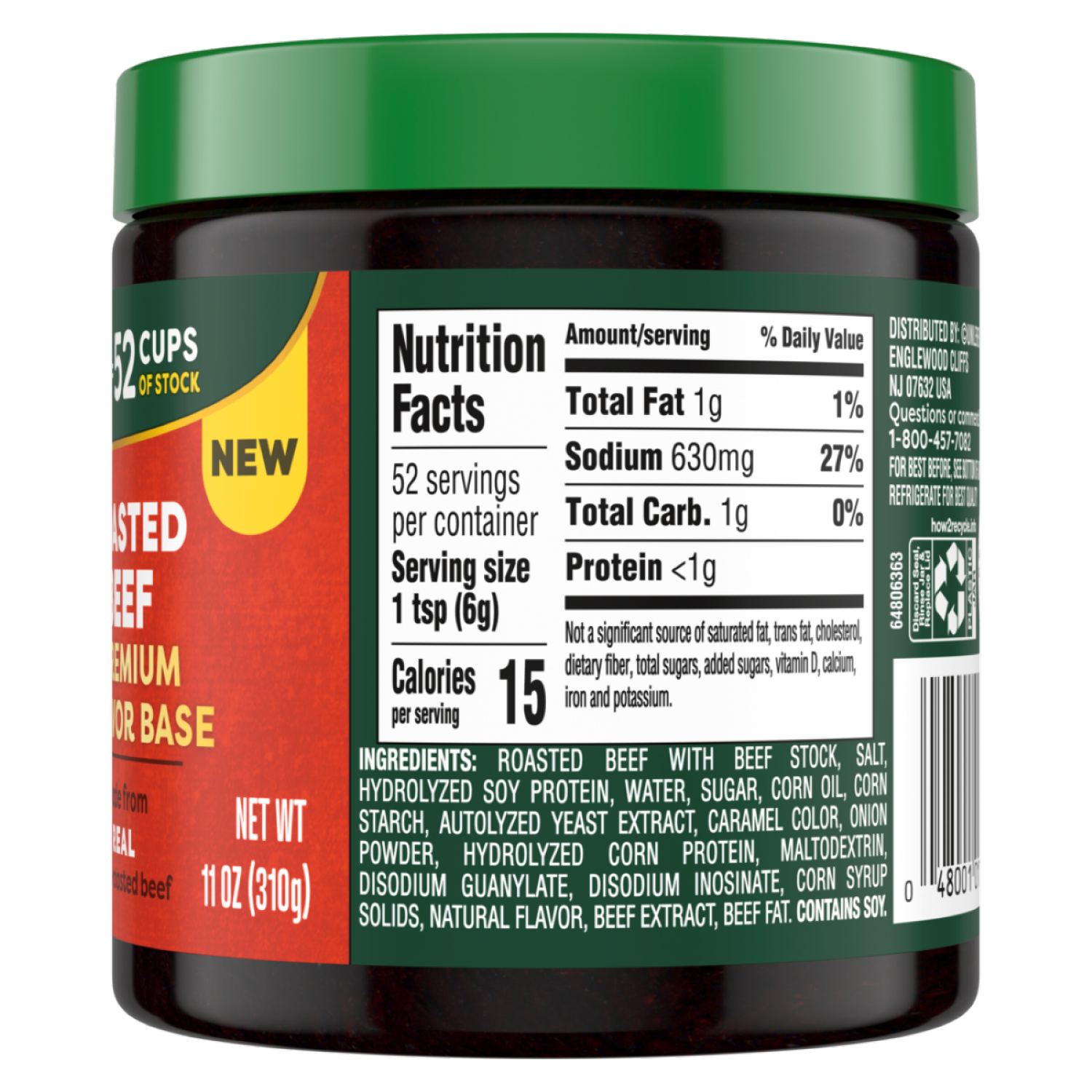 Roasted Beef with Beef Stock, Salt, Hydrolyzed Soy Protein, Water, Sugar, Corn Oil, Corn Starch, Autolyzed Yeast Extract, Caramel Color, Onion Powder, Hydrolyzed Corn Protein, Maltodextrin, Disodium G…