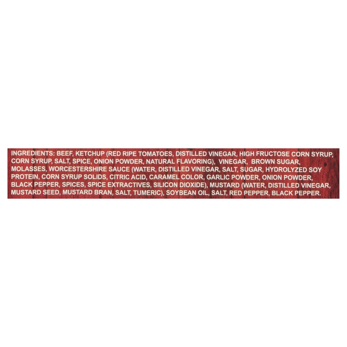 Beef, Ketchup (Red Ripe Tomatoes, Distilled Vinegar, High Fructose Corn Syrup, Corn Syrup, Salt, Spice, Onion Powder, Natural Flavoring), Vinegar, Brown Sugar, Molasses, Worcestershire Sauce (Water, D…