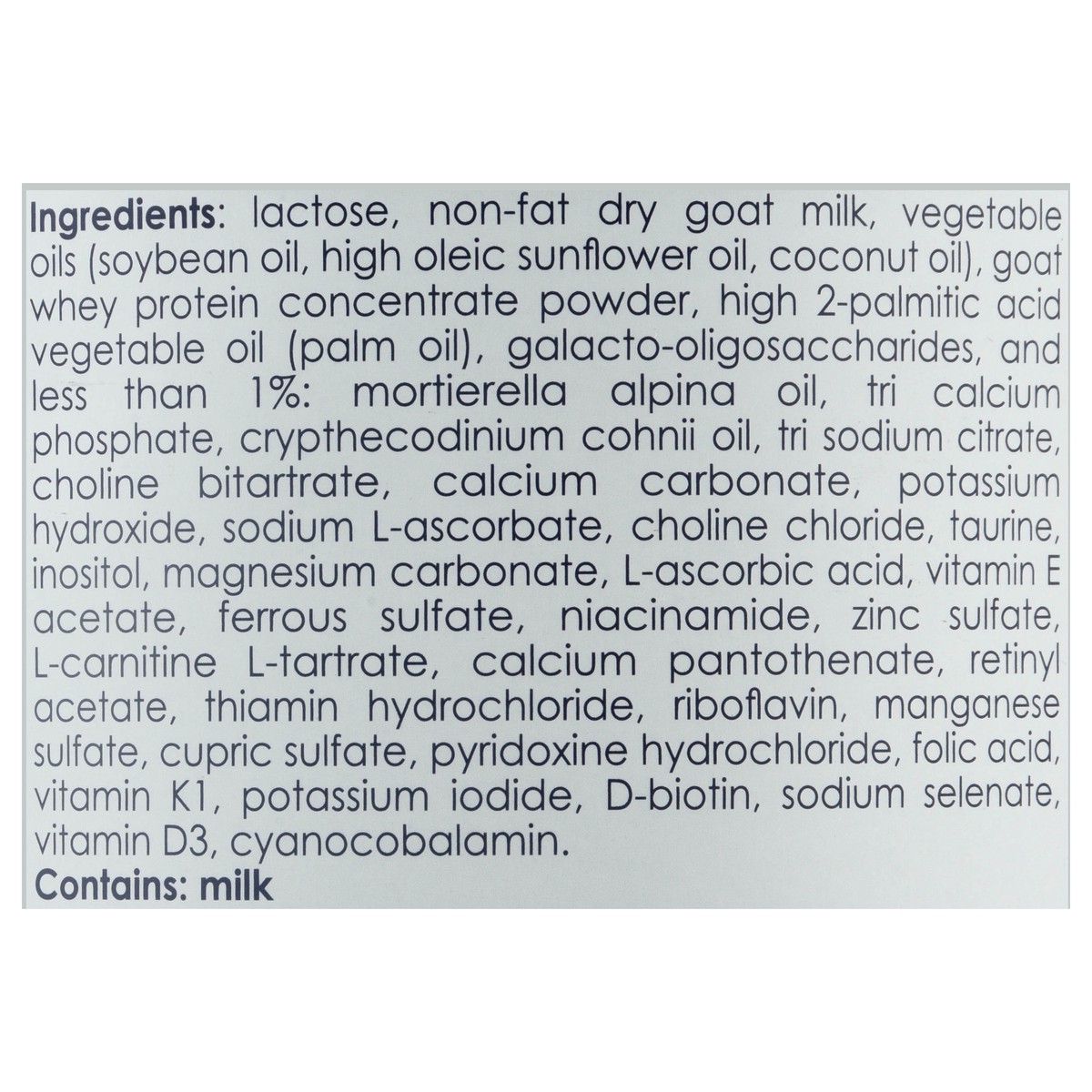 Lactose, Non-Fat Dry Goat Milk, Vegetable Oils (Soybean Oil, High Oleic Sunflower Oil, Coconut Oil), Goat Whey Protein Concentrate Powder, High 2-Palmitic Acid Vegetable Oil (Palm Oil), Galacto-Oligos…