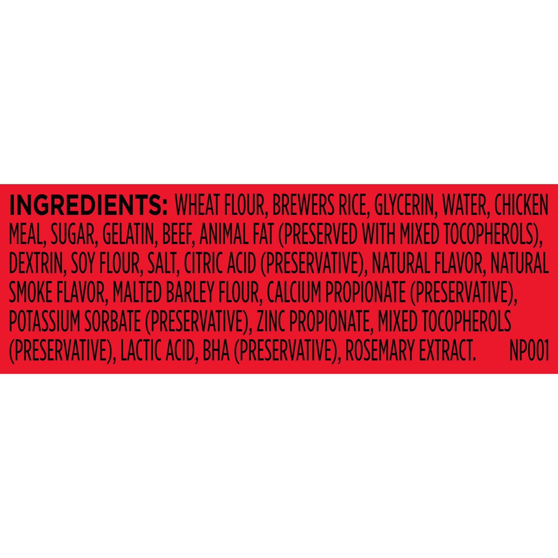 Wheat Flour, Brewers Rice, Glycerin, Water, Chicken Meal Sugar, Gelatin, Beef, Animal Fat (Preserved with Mixed Tocopherols), Dextrin, Soy Flour, Salt, Citric Acid (Preservative), Natural Flavor, Natu…