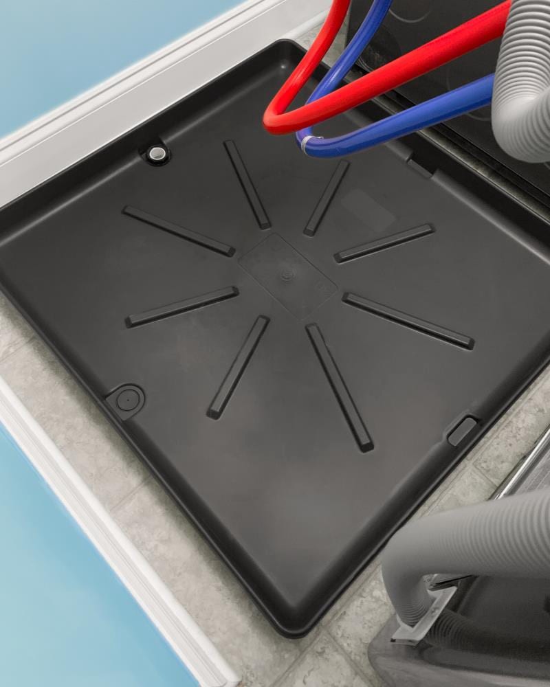 Protects your floor from damaging water leakage. Standard size is ideal for top-loading machines. High impact polypropylene plastic for superior strength will not crack or corrode. Includes PVC fittin…