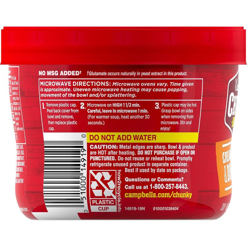 - Campbell's Chunky Soup: One 15.25 oz microwavable bowl of Campbell's Chunky Creamy Chicken and Dumplings Soup