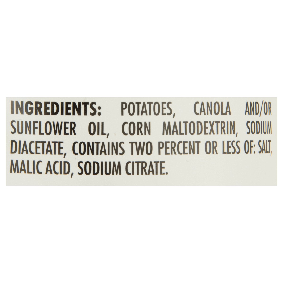 Potatoes, Canola and/or, Sunflower Oil, Corn Maltodextrin, Sodium Diacetate, Contains Two Percent or Less of: Salt, Malic Acid, Sodium Citrate.